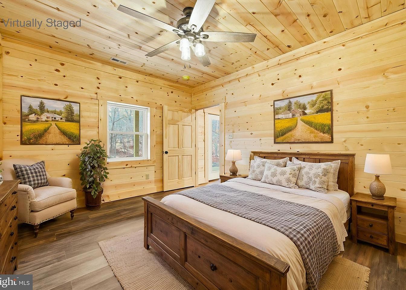 This cozy bedroom features warm wood paneling that enhances the rustic charm, with natural textures adorning the walls and ceiling. The space is anchored by a sturdy wooden bed dressed in soothing shades of gray and soft white linens with decorative pillows. Two bedside tables with lamps introduce ambient lighting, while a tasteful artwork depicting a scenic path adds visual interest. A corner chair with plaid accents complements the earth-toned decor. The warm-toned flooring contrasts beautifully with the blonde wood walls, and a potted plant brings a touch of life, creating an inviting and serene atmosphere.
