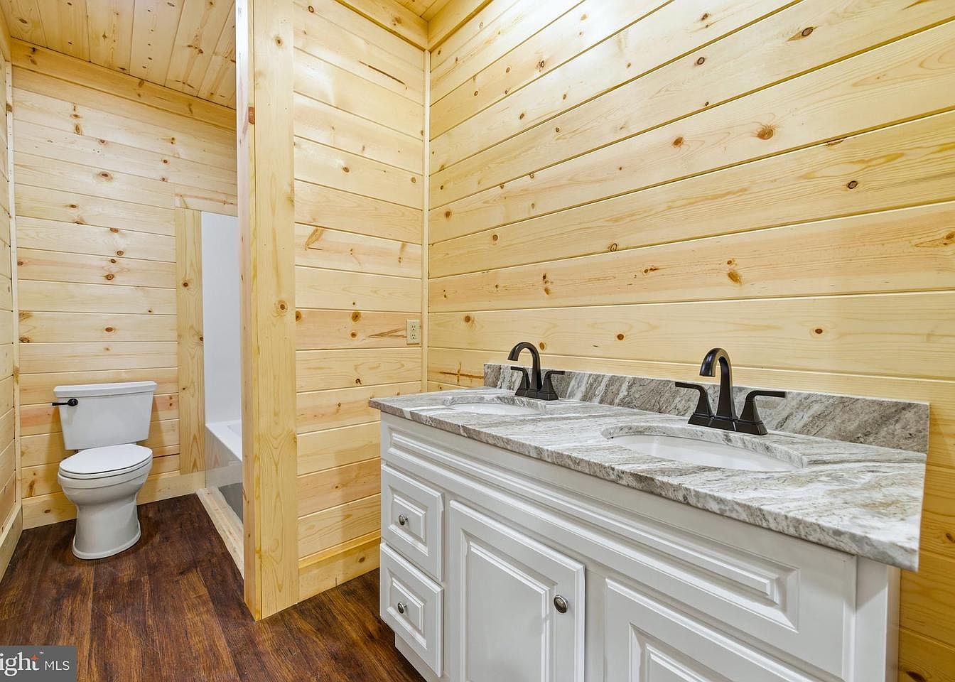 This bathroom features a cozy layout with natural wood elements and modern fixtures. The walls and ceiling are adorned with smooth, light-colored wood paneling, creating a rustic yet elegant atmosphere. A dual sink vanity with a gray-veined marble countertop adds a touch of sophistication, complemented by sleek black faucets. The flooring is dark wood, which contrasts beautifully with the light walls. Adjacent to the sink area, a clean, white toilet is visible. A partial wall separates the bathing area, enhancing privacy. Overall, the blend of materials and finishes presents a warm, inviting aesthetic.