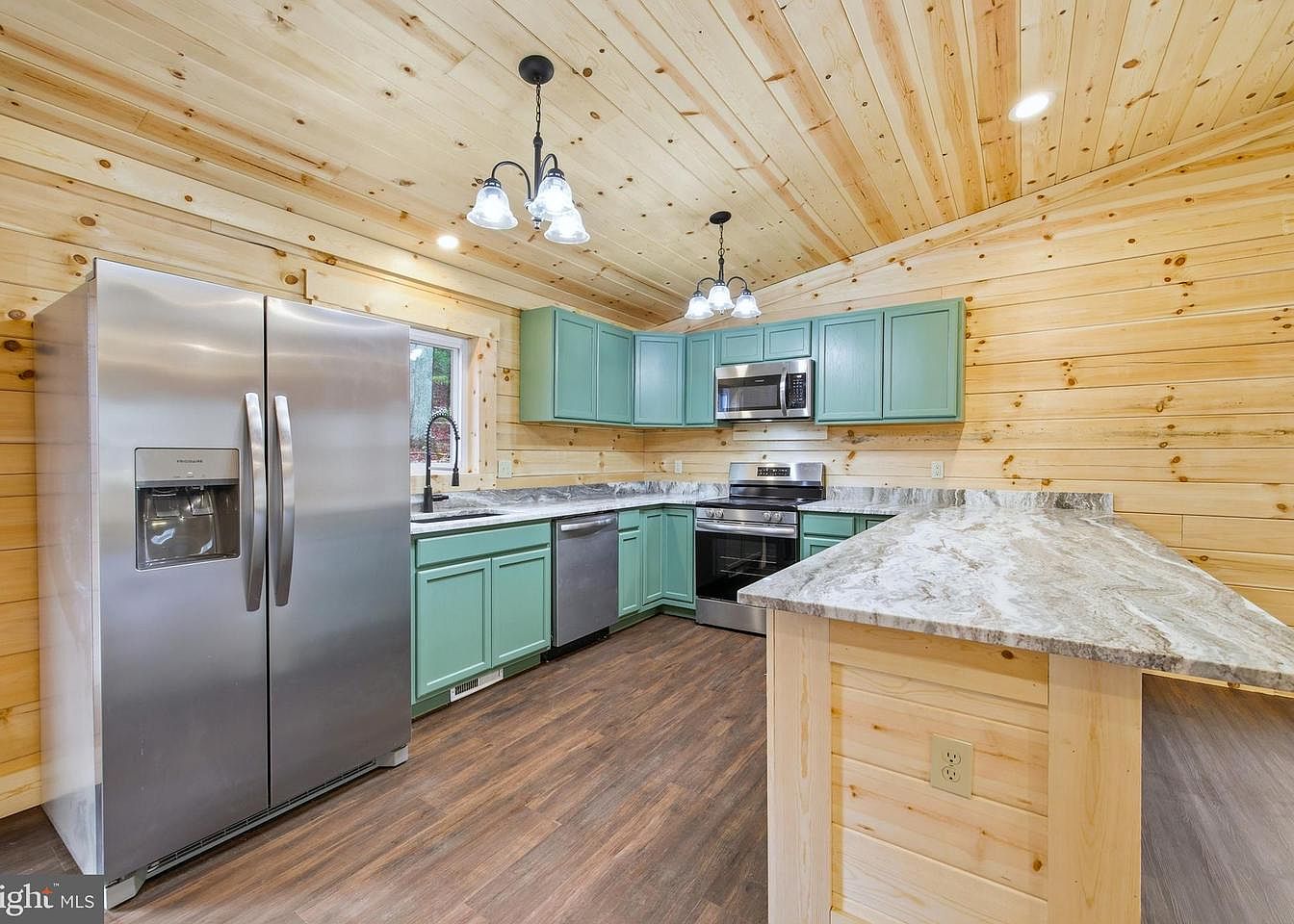 The kitchen features a blend of modern and rustic aesthetics. Light wood paneling lines the walls and ceiling, creating a warm, inviting atmosphere. Soft teal cabinetry contrasts beautifully with the natural wood tones, enhancing the space’s charm. A sleek stainless steel refrigerator stands prominently, complemented by a stainless steel dishwasher and a modern microwave. The countertop showcases a rich, marbled pattern, adding elegance. A spacious island provides additional workspace and acts as a gathering point. Three pendant lights hang from the ceiling, illuminating the area, while large windows invite natural light, enriching the overall ambiance.
