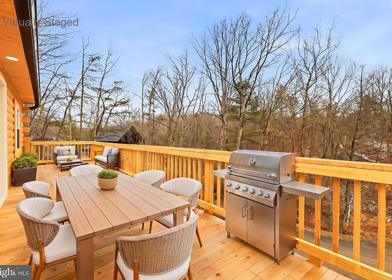 This outdoor deck features a spacious wooden layout accented with a natural finish and stylish design elements. A rectangular dining table made of light wood serves as the centerpiece, surrounded by six round, white, upholstered chairs that invite comfort. Adjacent, a sleek stainless steel grill offers a modern touch, perfect for outdoor cooking. To one side, a cozy seating area is arranged with two lounge chairs, framing a small side table adorned with a potted plant. The backdrop showcases bare trees, enhancing the rustic, tranquil feel of the space, making it ideal for relaxation or entertaining.