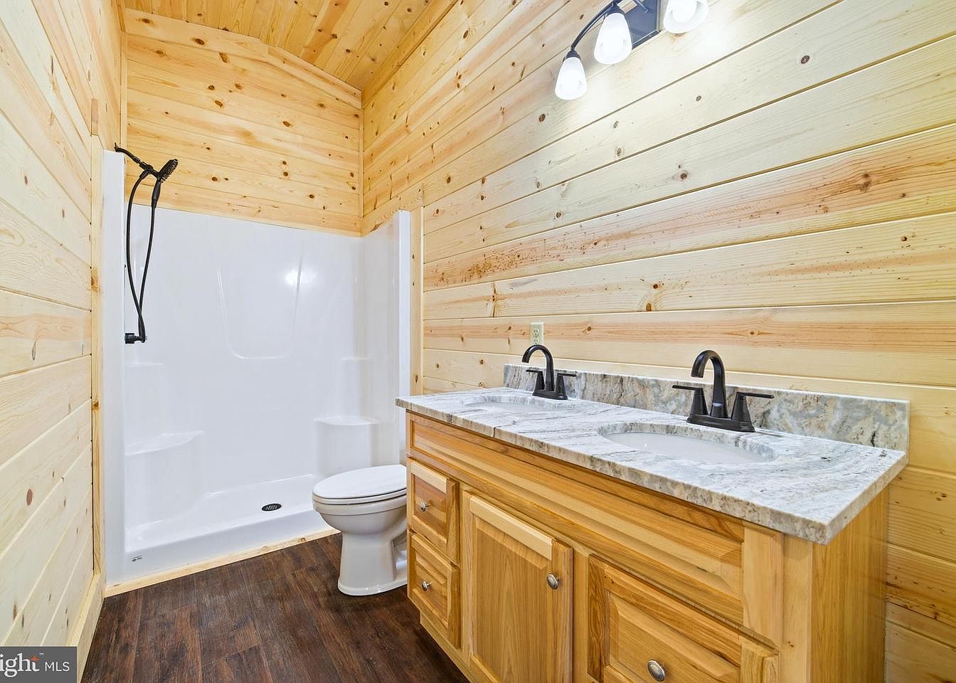 This bathroom features a rustic design with natural wood paneling covering the walls and ceiling, creating a warm and inviting atmosphere. The floor has dark wood planks, providing a striking contrast to the light wooden walls. A sleek, white shower stall offers modern functionality against the warm tones of the wooden elements. The dual sink vanity, made of light-toned wood, is topped with a beautiful, marbled countertop that complements the overall design. Matte black faucets elegantly contrast with the stone, adding a contemporary touch to the traditional rustic aesthetic.