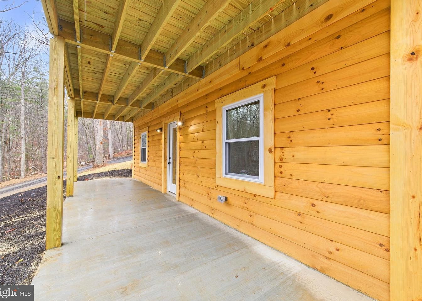 The front porch features a spacious concrete floor with a warm, inviting wooden structure overhead. The walls are constructed from honey-toned logs, showcasing natural grains and knots, enhancing the rustic charm. Two windows on the side allow natural light to illuminate the entryway, while modern lighting fixtures provide function and style. The clean white door adds a contemporary touch against the natural wood. Surrounding the porch, the landscape features lightly forested areas, providing a serene backdrop. Overall, this area combines traditional log construction with modern elements, ideal for relaxation and embracing nature.