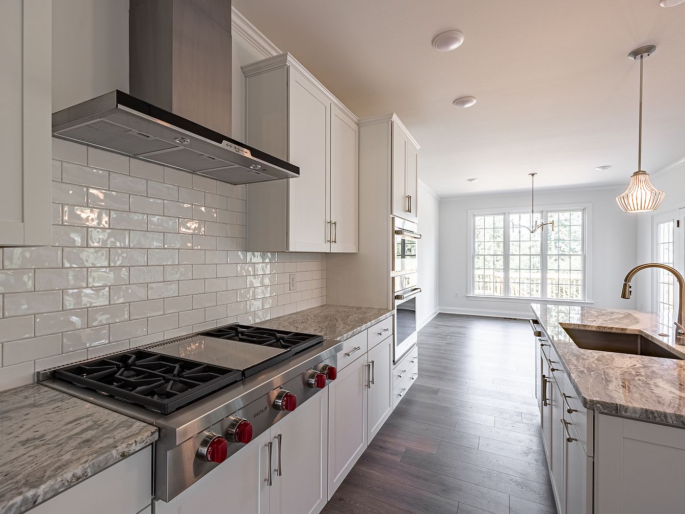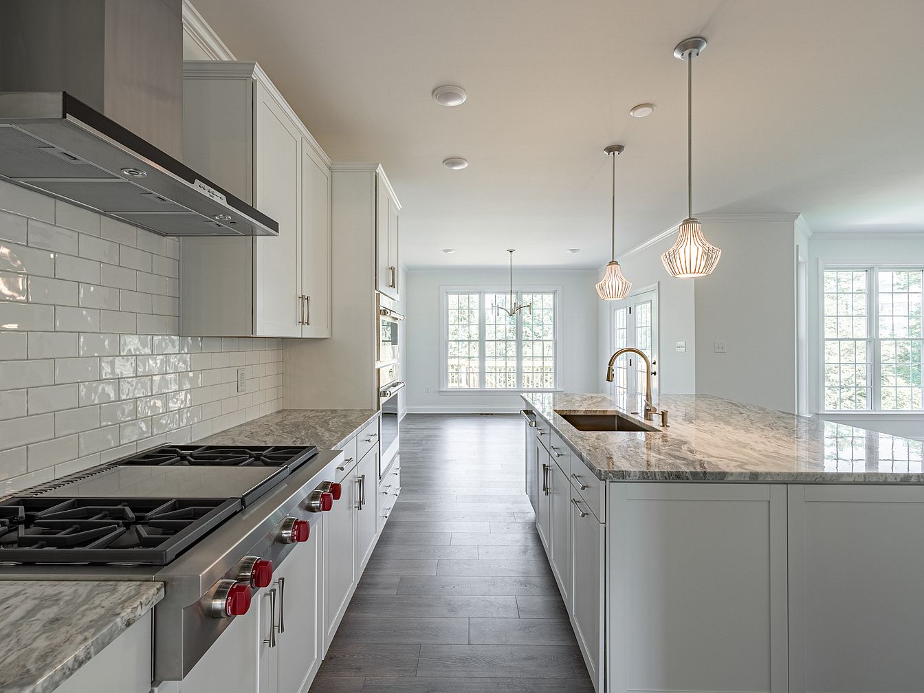 The kitchen showcases a modern design with sleek white cabinetry and a contrasting dark hood above the stainless steel gas range. Backsplash tiles in glossy white subway style add a timeless touch. Countertops in a light granite with swirling gray patterns provide both elegance and functionality. Natural light floods the space from large windows, enhancing the airy feel of the room. Pendant lighting with a ribbed glass design hangs above the island, adding visual interest. The hardwood flooring in a warm tone complements the overall aesthetic, creating a cohesive and inviting cooking environment.