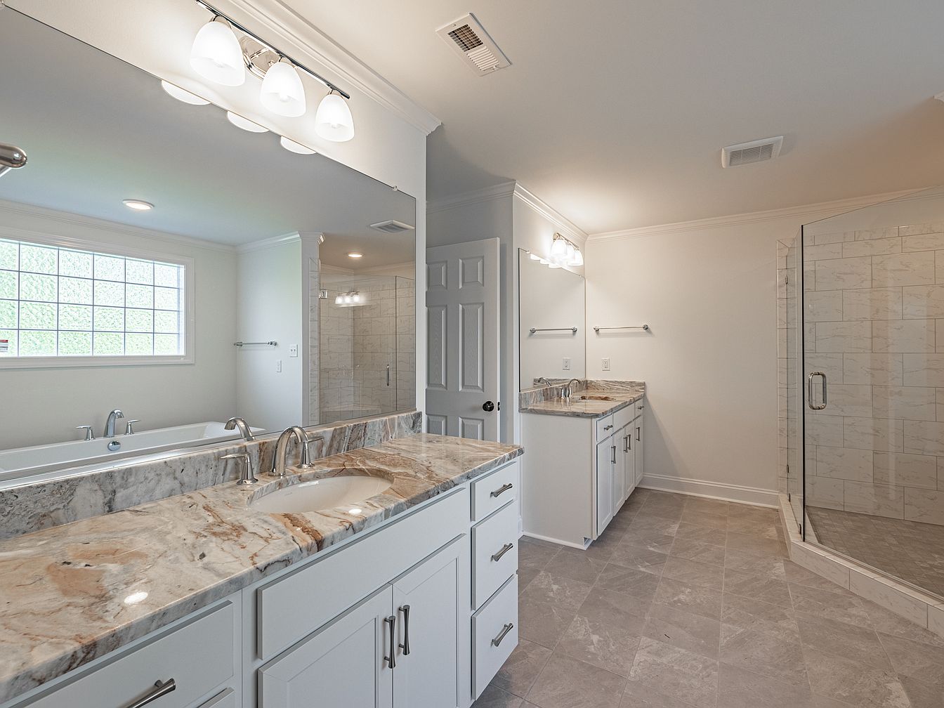 Featuring a spacious layout, the bathroom showcases a dual sink vanity with a stunning, veined granite countertop that adds sophistication. The cabinetry is painted white, creating a clean and modern aesthetic. A large frameless glass shower is enclosed in one corner, the wall covered with light-colored tiles, enhancing the feeling of openness. Natural light flows from a frosted window, providing privacy while brightening the space. Soft overhead lighting complements chrome fixtures, ensuring functionality. Neutral grey flooring integrates seamlessly with the overall color scheme, lending a serene and elegant atmosphere to the room.