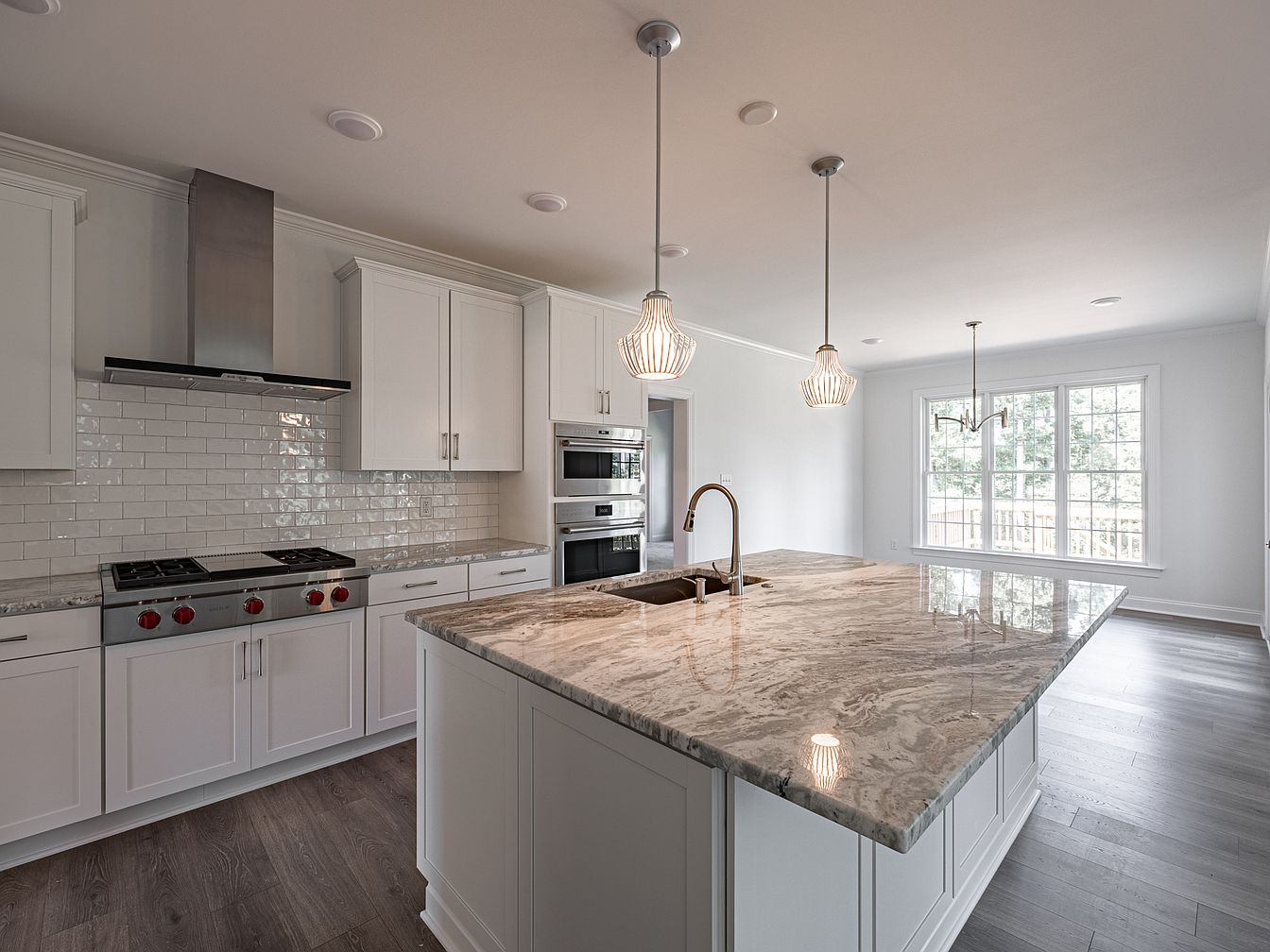 A modern kitchen featuring a large, elegant island with a striking marble countertop that blends shades of gray and white, creating a sophisticated focal point. The custom cabinetry is a crisp white, complementing the pristine subway tile backsplash. Above, stylish pendant lights cast a warm glow, enhancing the airy atmosphere. Stainless steel appliances, including a gas stove and built-in ovens, gleam against the light, reflective surfaces. Natural light floods the space from the expansive windows, illuminating the rich wood flooring. This design merges contemporary aesthetics with functionality, perfect for both cooking and social gatherings.