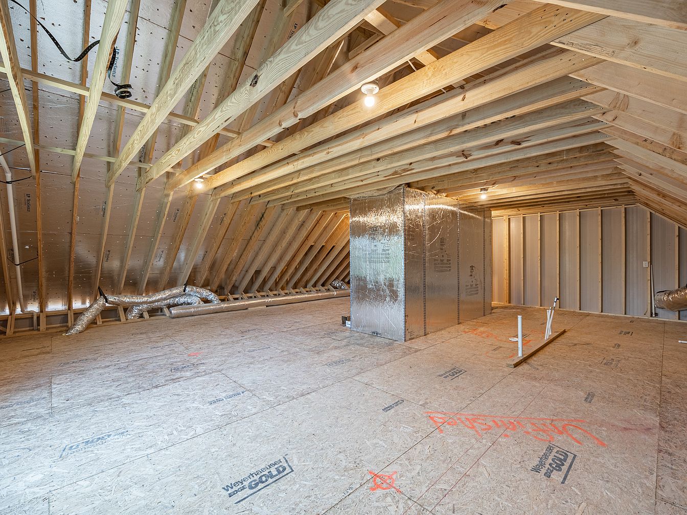 The attic space showcases a raw and open design, defined by exposed wooden beams that highlight the sloping ceiling. The wooden framework provides a rustic charm while the large, light-filled area creates an inviting atmosphere. The flooring is made of oriented strand board, marked with construction details. Silver ductwork snakes along the walls, hinting at the efficient heating and cooling system installed. A metallic box in the center suggests potential for added utility, while the overall simplicity lends a vast, airy feel. Neutral tones dominate the design, complemented by soft, ambient lighting from ceiling fixtures.