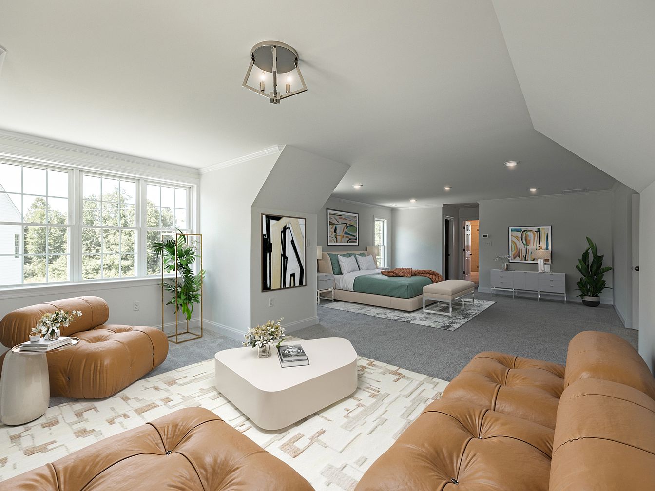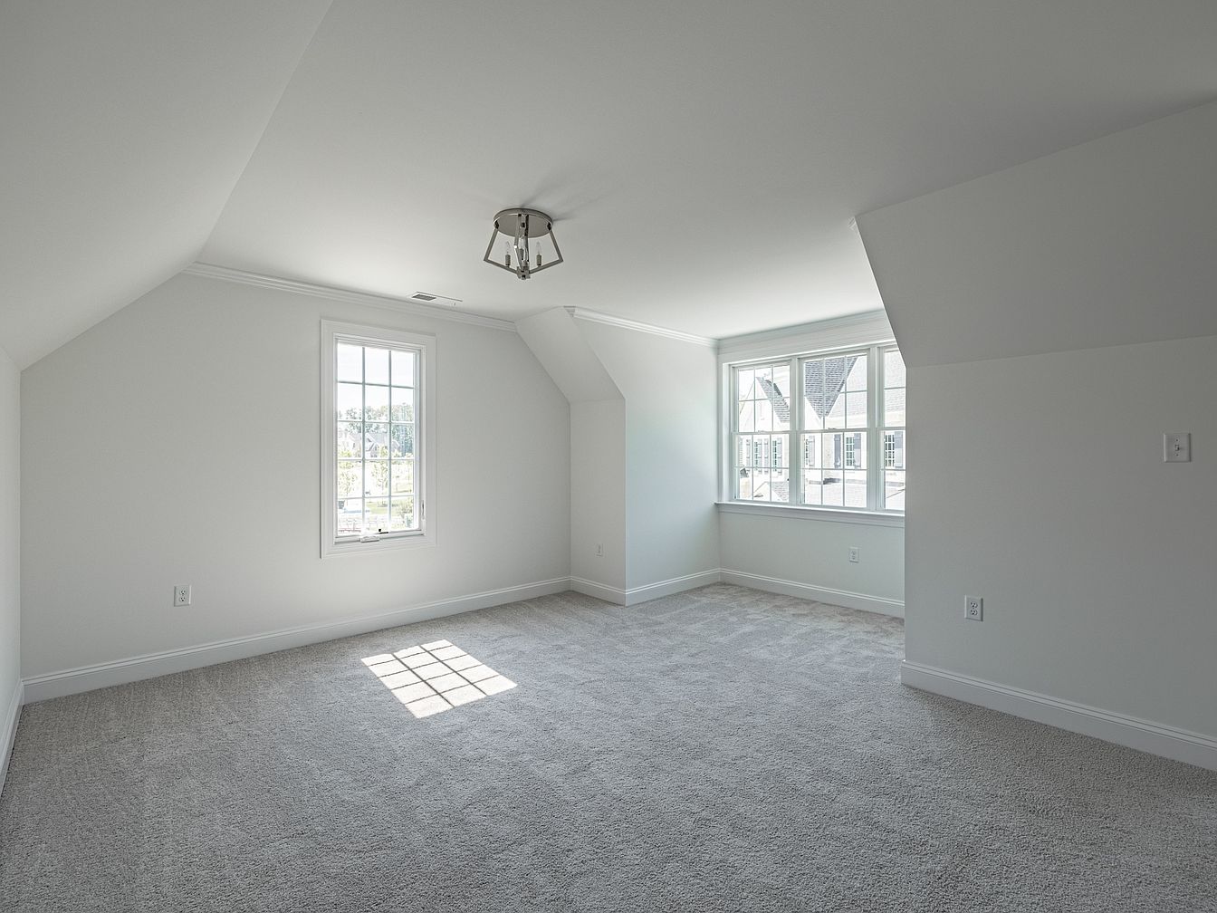 This is a spacious bedroom characterized by sloped ceilings that enhance its unique architectural charm. The walls are painted in a soft, neutral tone, complemented by plush, light gray carpet that provides comfort underfoot. Natural light streams in through large windows, casting gentle reflections on the surfaces. A contemporary light fixture hangs from the ceiling, adding a modern touch. The presence of multiple windows allows for excellent ventilation and views of the outdoors. The room is designed to be clean and minimalist, providing a versatile space suitable for personal expression and comfort.