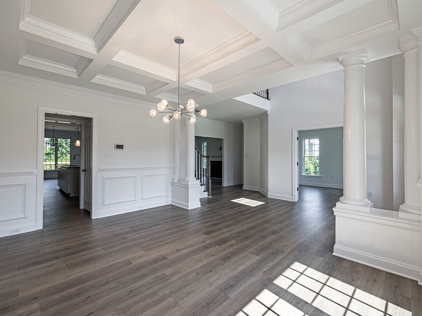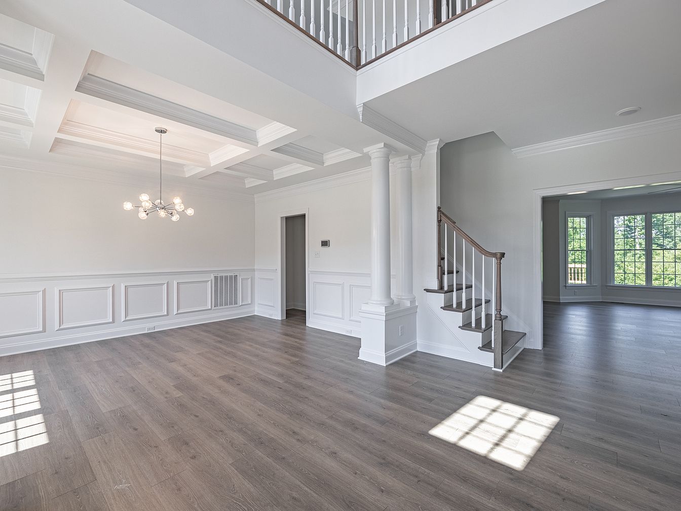 This spacious living room features an open layout with high coffered ceilings, adding depth and elegance. The walls are painted a soft white, contrasting with warm, medium-toned wooden flooring that enhances the inviting atmosphere. Elegant white wainscoting runs along the lower walls, providing classic architectural detail. A modern chandelier with spherical glass bulbs hangs centrally, casting a warm glow. Light streams in through large windows, creating a bright and airy environment. Columns delineate the space, supporting the upper floor while adding a grand feel. The room flows seamlessly to adjoining spaces, promoting an engaging and welcoming vibe.