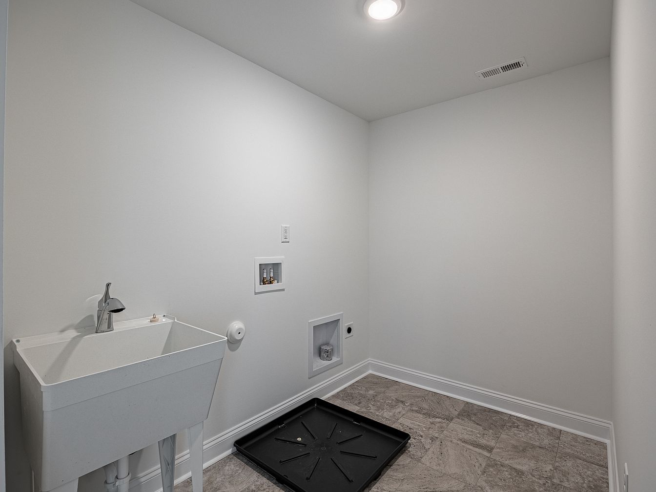This laundry room features a minimalist design with a practical layout. The walls are painted a clean white, enhancing the sense of spaciousness. A large, deep utility sink with a sleek faucet occupies one corner, providing functionality for various tasks. The flooring consists of large, gray veined tiles that add a modern touch while remaining easy to maintain. A drain pan sits on the floor, indicating an area for potential laundry appliances. Recessed lighting brightens the space, ensuring visibility. Overall, the design prioritizes utility while maintaining a contemporary and uncluttered aesthetic.