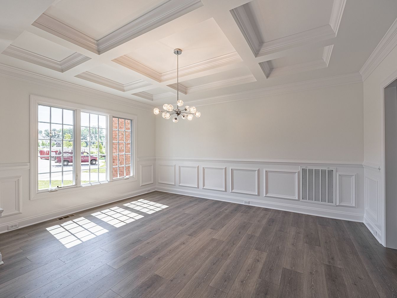 This dining room features a spacious layout with an elegant coffered ceiling, adding depth and architectural interest. The neutral color scheme is dominated by soft whites and light woods, creating a bright, airy atmosphere. Large windows allow natural light to flood the room, casting dynamic shadows across the pale wooden floor. Wainscoting adorns the lower half of the walls, enhancing the classic charm. A modern chandelier with spherical bulbs hangs centrally, providing stylish illumination and a contemporary touch. The overall aesthetic reflects a harmonious blend of traditional and modern elements, ideal for both entertaining and intimate dining.
