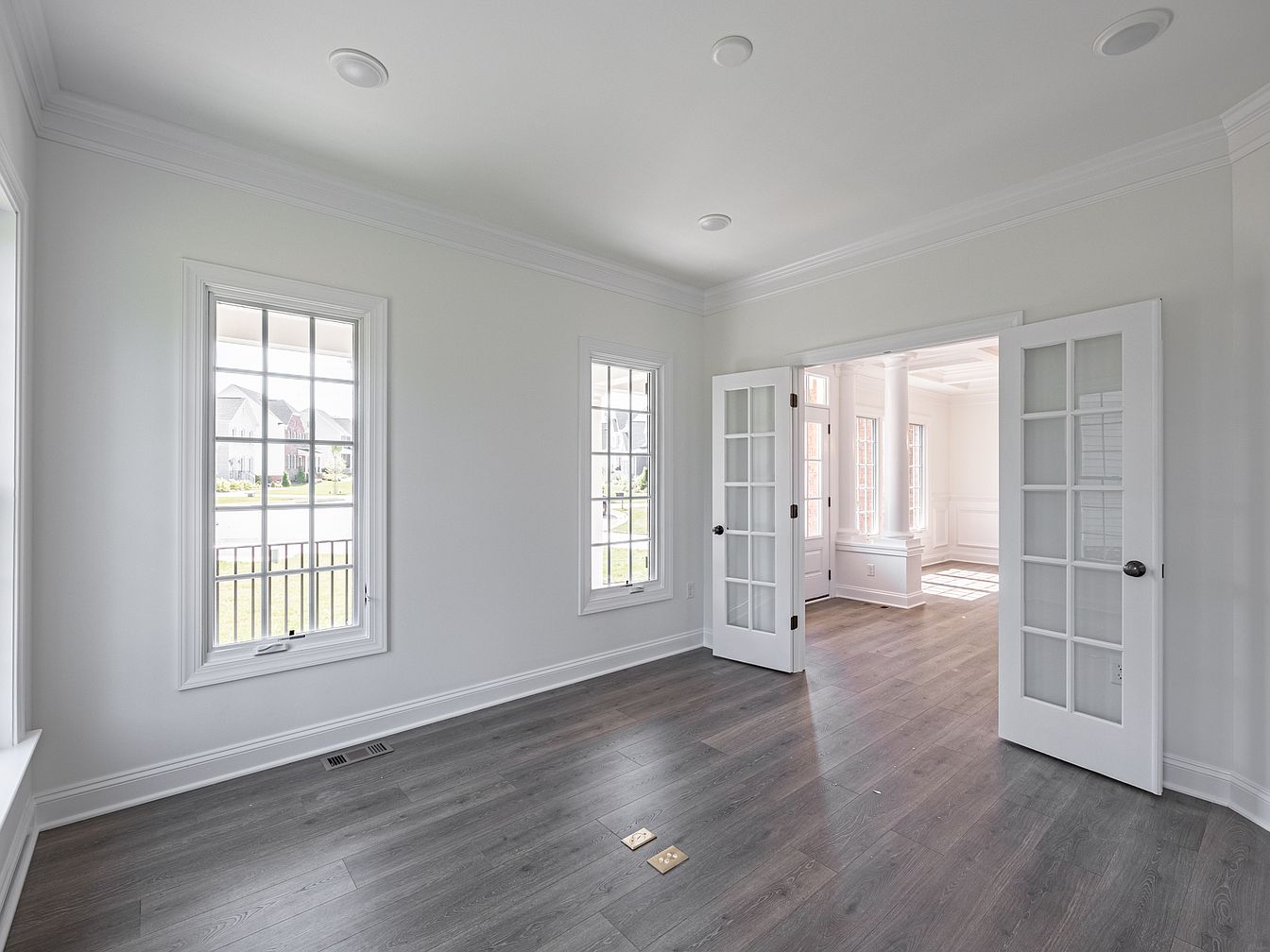 This spacious living room features a bright color palette with soft white walls and large windows that allow ample natural light. The room has a modern design with elegant crown molding and recessed lighting adding sophistication. Light gray flooring contrasts beautifully with the clean lines of the double French doors leading to another room. The arrangement of windows offers picturesque views of the outdoor landscape, enhancing the airy atmosphere. The transitional style merges classic architectural elements with contemporary aesthetics, creating a welcoming and versatile space for both relaxation and entertaining.