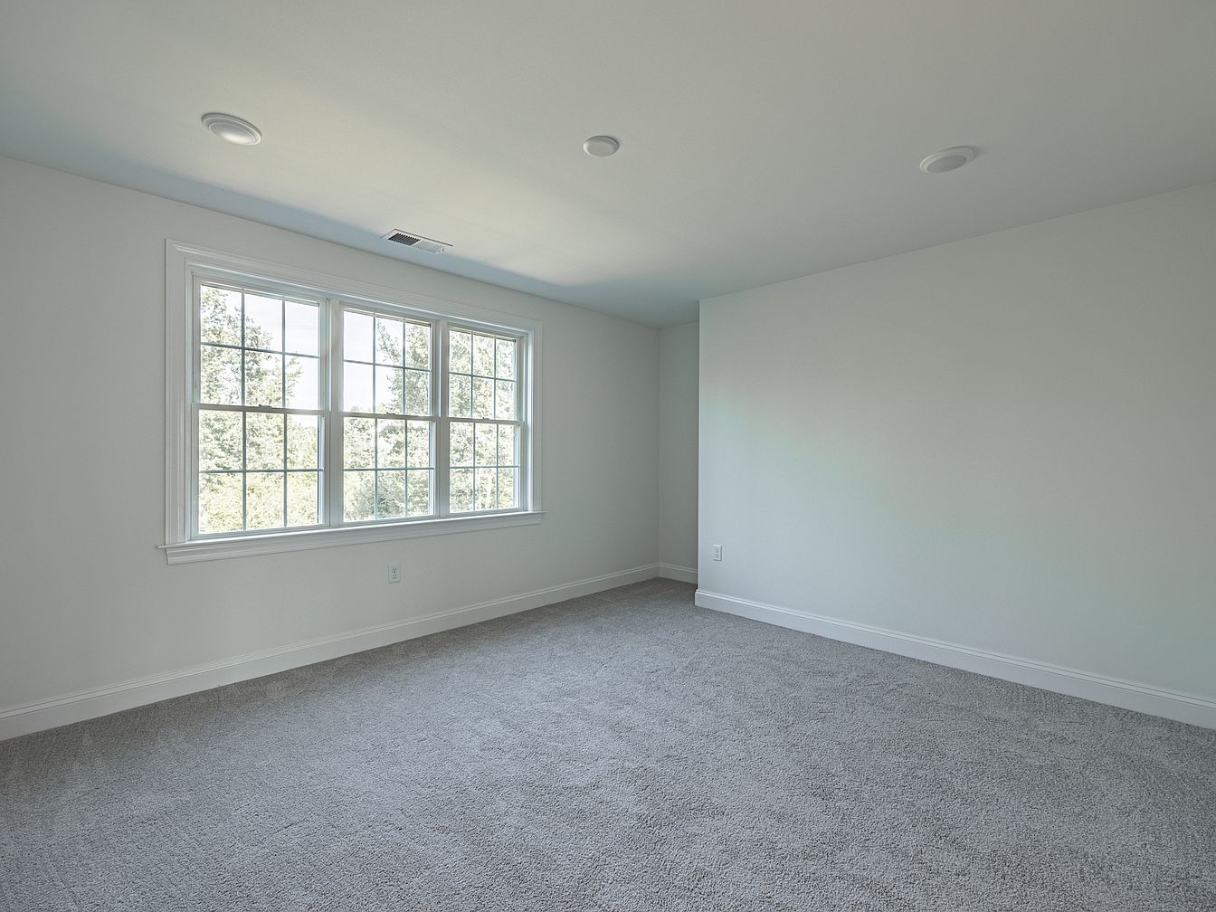 This bedroom features a spacious layout marked by soft gray carpeting that adds warmth and comfort. The walls are painted a subtle off-white, creating a serene backdrop. A prominent feature is the large window that spans the room, allowing ample natural light to filter in, while offering views of the lush greenery outside. The window is framed by white trim, enhancing the room’s brightness. Smooth, modern recessed lighting fixtures in the ceiling provide additional illumination, ensuring the space remains well-lit. Overall, the design combines simplicity with functionality, making it an inviting retreat.
