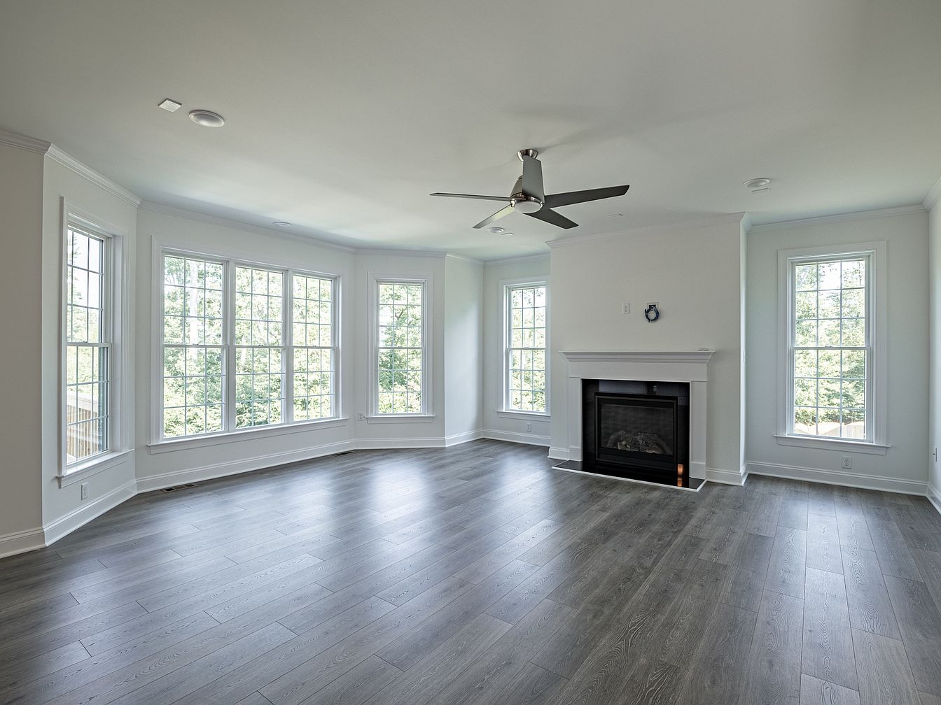 This spacious living room features a harmonious blend of natural light and contemporary design. Large, white-framed windows line the walls, offering scenic views and an airy ambiance. The light gray hardwood floors create a warm backdrop, while crisp white walls amplify brightness. A sleek, modern ceiling fan adds functionality and style. The focal point is a stylish fireplace, framed with elegant molding, inviting warmth to the room. Minimalist decor enhances the expansive space, emphasizing comfort and simplicity. The absence of heavy furnishings allows for a flexible layout, perfect for both relaxation and entertaining in this inviting atmosphere.