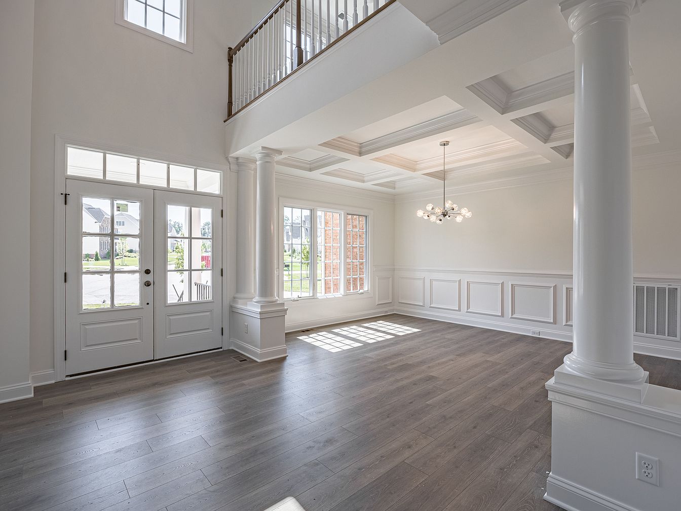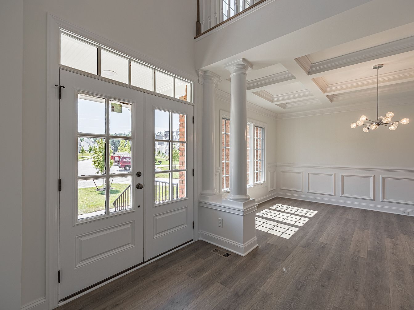 This entryway features tall white walls with an elegant coffered ceiling, emphasizing a sense of spaciousness. Natural light floods in through large, multi-paneled windows surrounding a classic double door, enhancing the bright atmosphere. The flooring is a warm, light wood, harmonizing with the crisp white trim and paneling that adorns the lower half of the walls. Highlighting the modern design is a contemporary chandelier, adding a stylish focal point. Two robust columns flank the space, providing structural elegance. Overall, the design conveys a blend of modern sophistication and timeless style, setting an inviting tone for the home.