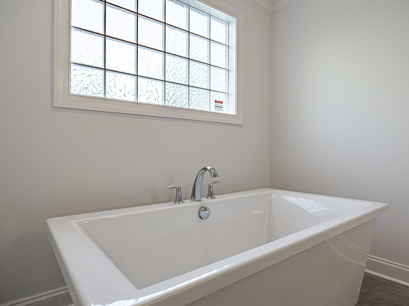 A freestanding white bathtub sits prominently in a modern bathroom, showcasing a sleek, minimalist design. The tub features clean lines and a contemporary silhouette, enhancing the space’s airy feel. Above the tub, a textured glass window allows natural light to filter in, creating a serene ambiance while maintaining privacy. The walls are painted a soft white, complementing the tub’s glossy surface, and the flooring consists of muted gray tiles, adding warmth without overwhelming the decor. Simple chrome fixtures contrast beautifully with the bathtub, highlighting the modern aesthetic while ensuring functionality in the bathing area.