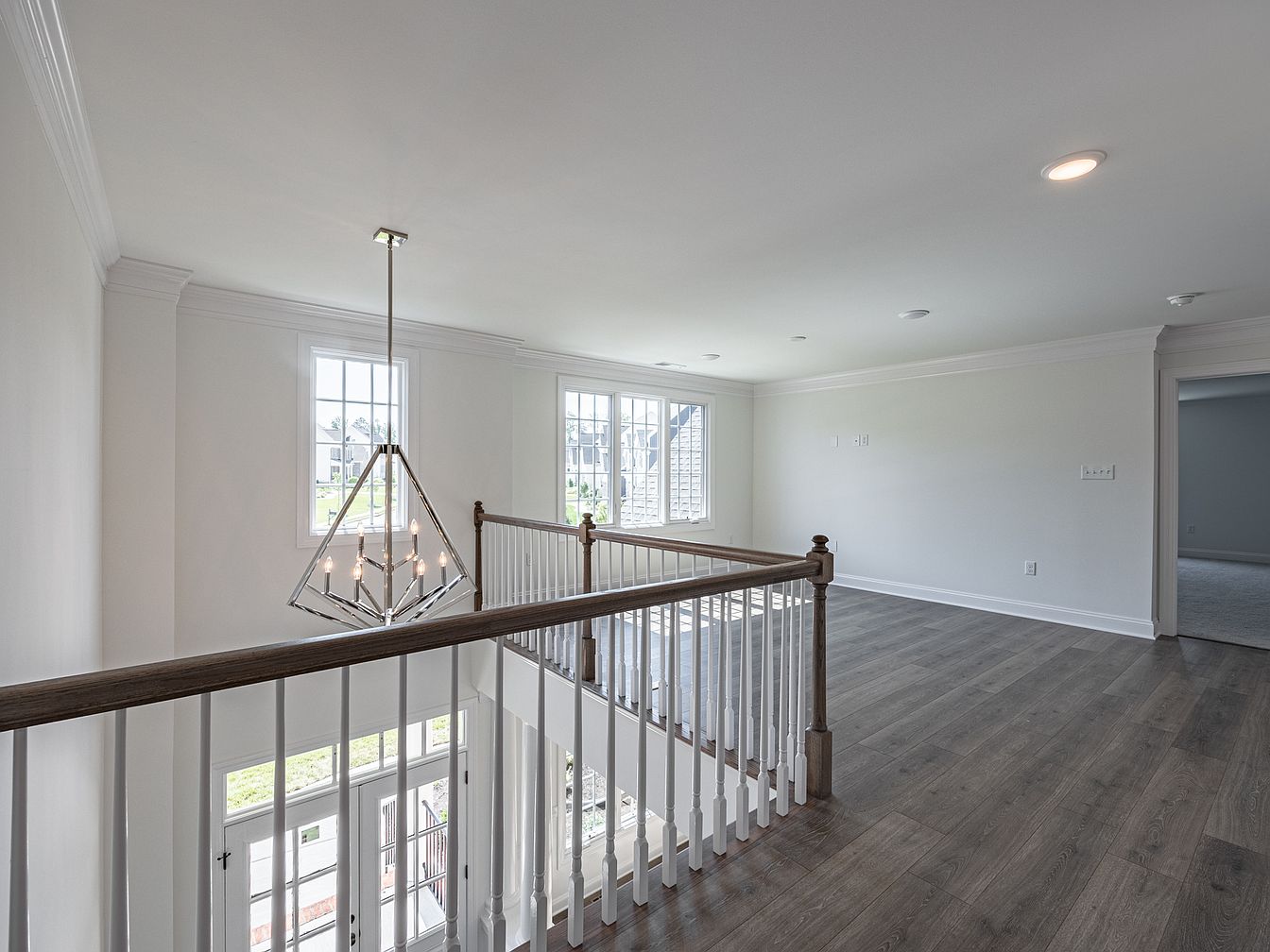 This well-lit staircase landing features sleek hardwood flooring that complements the modern aesthetic. A striking geometric chandelier hangs elegantly from the ceiling, casting a warm glow throughout the space. The walls are painted in a soft white shade, enhancing the openness and airiness. Large windows provide ample natural light and offer a view of the outside landscape. The railing, crafted from rich wood, adds a classic touch, harmonizing with the contemporary lighting. The trimwork around the windows and ceiling showcases attention to architectural detail, while the overall design strikes a balance between modern simplicity and timeless elegance.