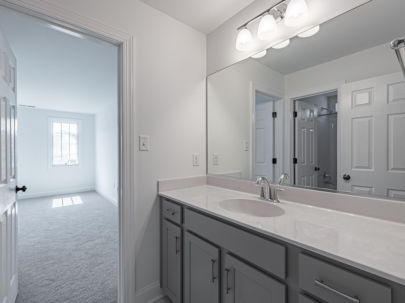 The bathroom features a contemporary vanity area, characterized by elegant grey cabinetry that complements the clean lines of the space. A wide countertop, crafted from a smooth material, extends across the vanity, providing ample room for toiletries. Above, a well-lit mirror reflects the soft, ambient lighting from three frosted glass fixtures, enhancing the room’s airy feel. The walls are painted a crisp white, while the plush carpet underfoot adds warmth and comfort. Beyond the vanity, an open doorway reveals a bright, empty room with a large window, inviting natural light and offering a sense of spaciousness.
