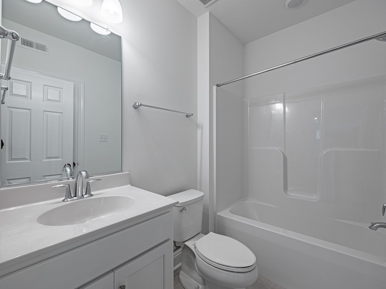 A modern bathroom featuring a clean, minimalist design. The color scheme is dominated by crisp white walls, complemented by a light grey tiled floor. A double vanity with a sleek white countertop hosts polished chrome faucets. Above, bright LED lighting is enclosed in glass fixtures, enhancing the airy feel. Opposite the vanity, a standard toilet is neatly positioned, while a bathtub with integrated surround offers a seamless look. A large mirror spans the vanity, reflecting light and creating a sense of spaciousness. Architectural details include a classic six-panel door and a towel bar on the wall, maintaining functionality.