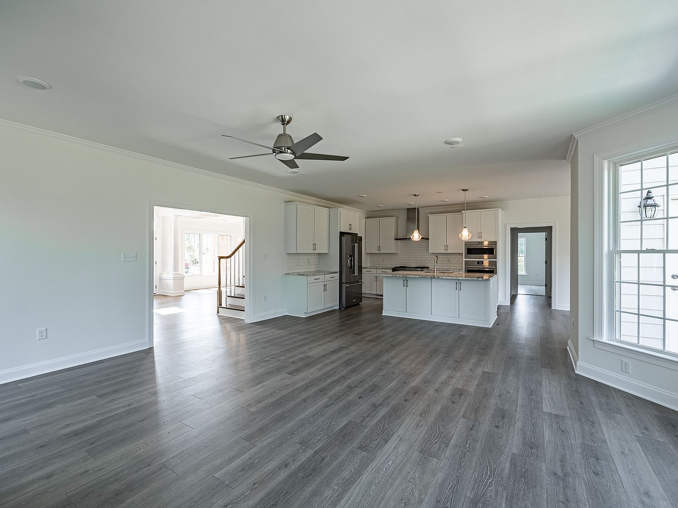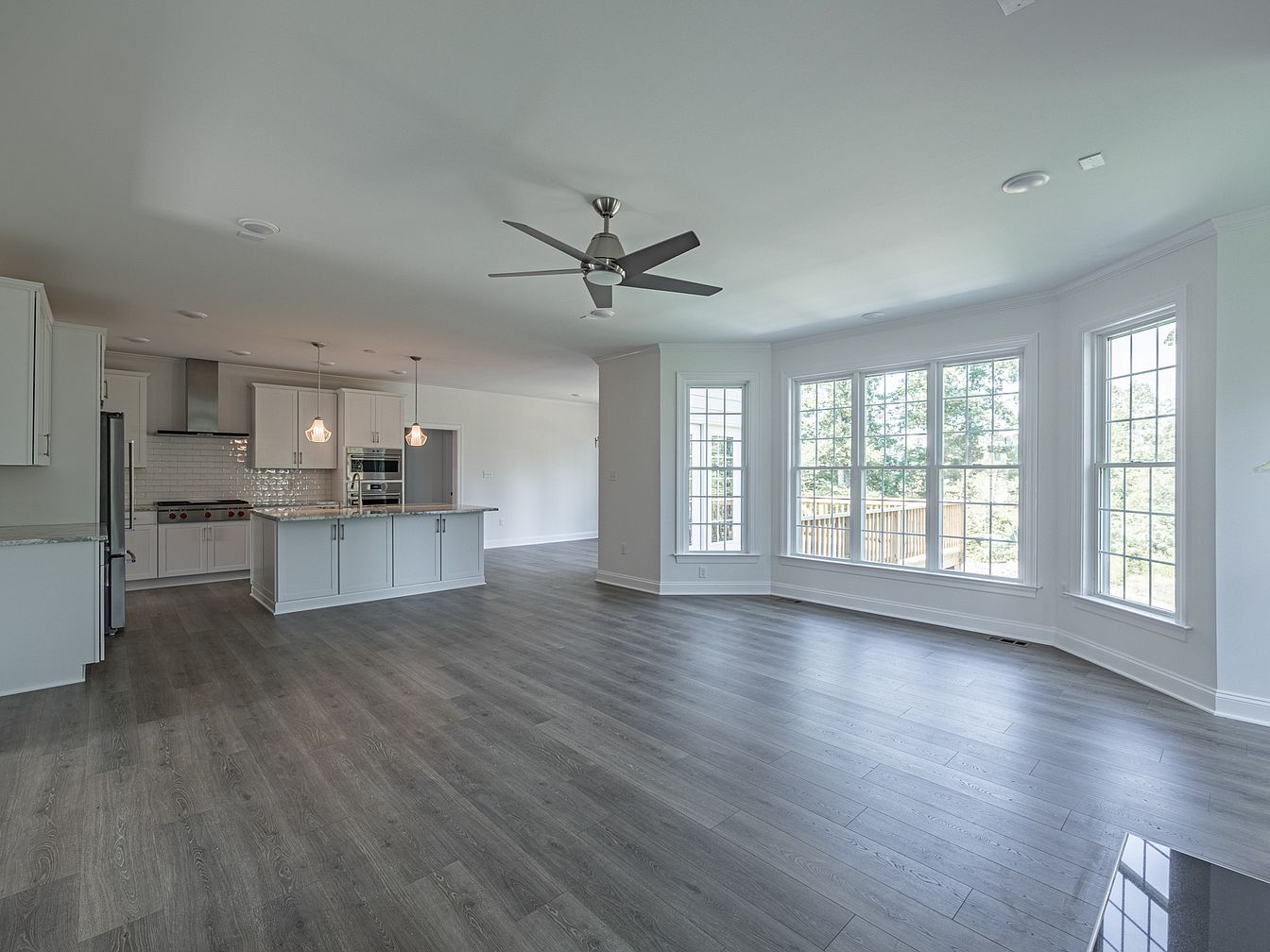 This spacious, airy room features a modern open layout that seamlessly connects the kitchen and living areas. Light wood flooring complements the crisp white cabinetry of the kitchen, where sleek appliances and a central island enhance functionality. Pendant lighting adds a touch of elegance, while the glossy backsplash reflects natural light. Large bay windows offer abundant light and picturesque views, enhancing the room’s openness. The walls are painted in soft neutral tones, creating a calming atmosphere. Architectural details like crown molding and wide trim accentuate the space, merging contemporary style with classic charm.