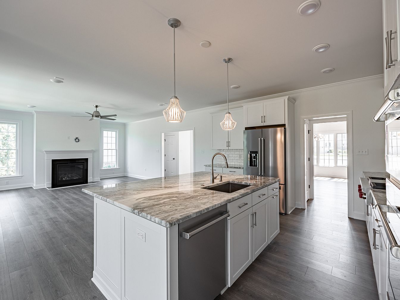 A modern kitchen featuring an expansive island with a striking granite countertop, complemented by sleek white cabinetry. Pendant lights hang above the island, adding a touch of elegance, while stainless steel appliances, including a fridge and a stovetop, reflect contemporary design. The open layout connects to a spacious living area, highlighted by a cozy fireplace framed by white molding. Light gray hardwood flooring runs throughout, enhancing the airy feel, and large windows allow abundant natural light, illuminating the space. Subtle white and gray color schemes create a soothing ambiance, perfect for both cooking and entertaining.