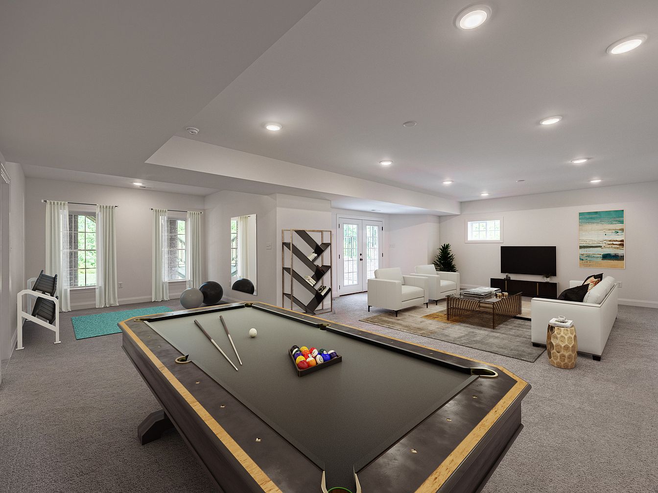 This spacious game room features a sleek pool table at the forefront, its dark surface contrasted by warm wood accents. The carpeted flooring provides a cozy feel, inviting relaxation. To the left, expansive windows dressed in sheer white curtains allow natural light to flood the space, enhancing the airy atmosphere. A vibrant turquoise rug adds a pop of color and defines the lounging area with contemporary white sofas and a stylish coffee table made of woven materials. A flat-screen TV sits against a neutral wall, complemented by an abstract ocean-inspired artwork, creating a casual yet sophisticated retreat.