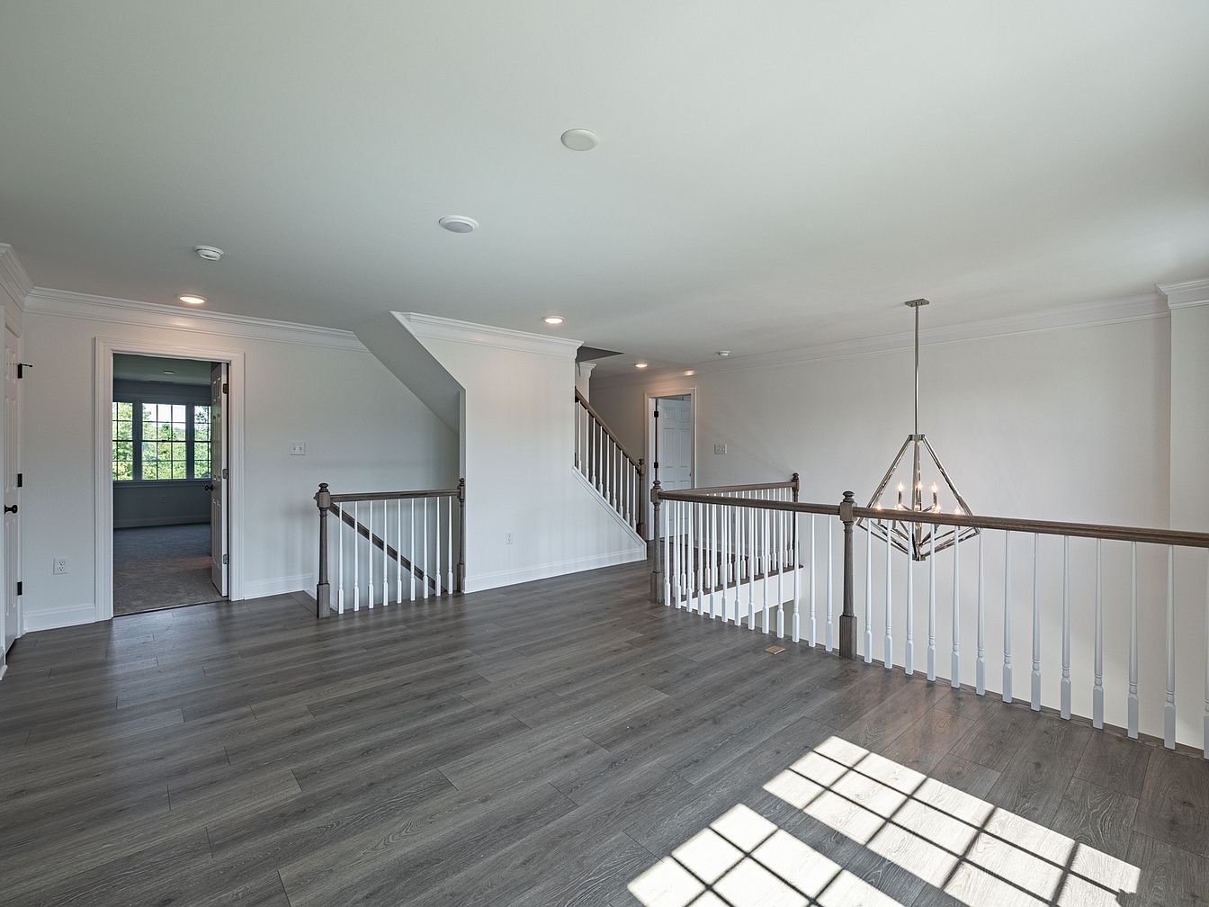 This spacious landing area features a light, neutral color palette with soft white walls and subtle gray flooring that enhances the openness of the space. The wood railing, with dark balusters and a light wooden cap, adds a touch of sophistication. A modern geometric chandelier hangs elegantly from the ceiling, providing ample light. Large windows on one side allow natural light to flood in, casting soft shadows on the floor. Doorways lead to adjacent rooms, suggesting a seamless flow throughout the house, while the overall layout invites a sense of tranquility and modern design.