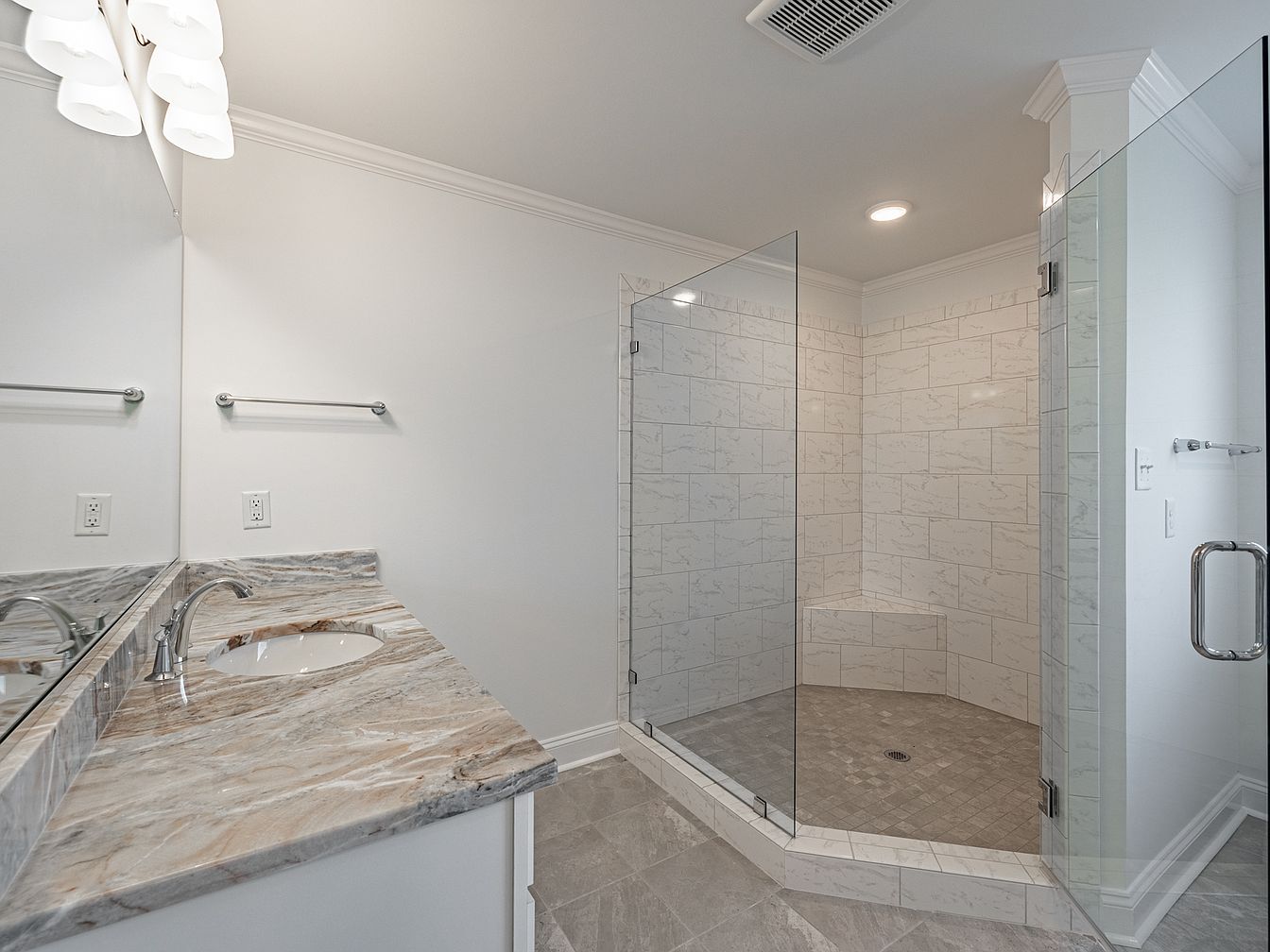 A modern bathroom featuring a spacious layout with elegant design elements. The dual sink vanity boasts a stunning granite countertop with swirling patterns, complemented by chrome fixtures. Above, stylish light fixtures enhance the ambiance. Against the wall, a large mirror amplifies the light. The walk-in shower showcases seamless glass doors, revealing intricate light-colored tiled walls and a tiled floor with a textured design, providing a luxurious feel. Soft neutral tones dominate the color scheme, creating a calm atmosphere. Carefully placed architectural details, like crown molding, add sophistication to the overall aesthetic of this contemporary space.