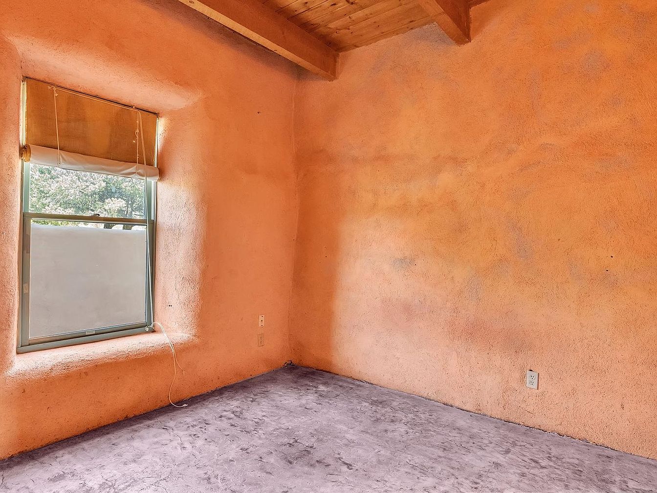This cozy bedroom corner features textured adobe-style walls in a warm peach tone, creating a soft and inviting environment ideal for families. Natural sunlight filters through a window with a deep sill, perfect for seating or decorative touches. The ceiling is crafted from exposed wooden beams, adding rustic charm and architectural interest. The floor is finished in a mottled gray concrete, providing a durable and easy-to-clean surface for children and pets. Electrical outlets positioned along the base of the walls offer flexibility for furniture arrangement or personal electronics, supporting a variety of family needs and activities.