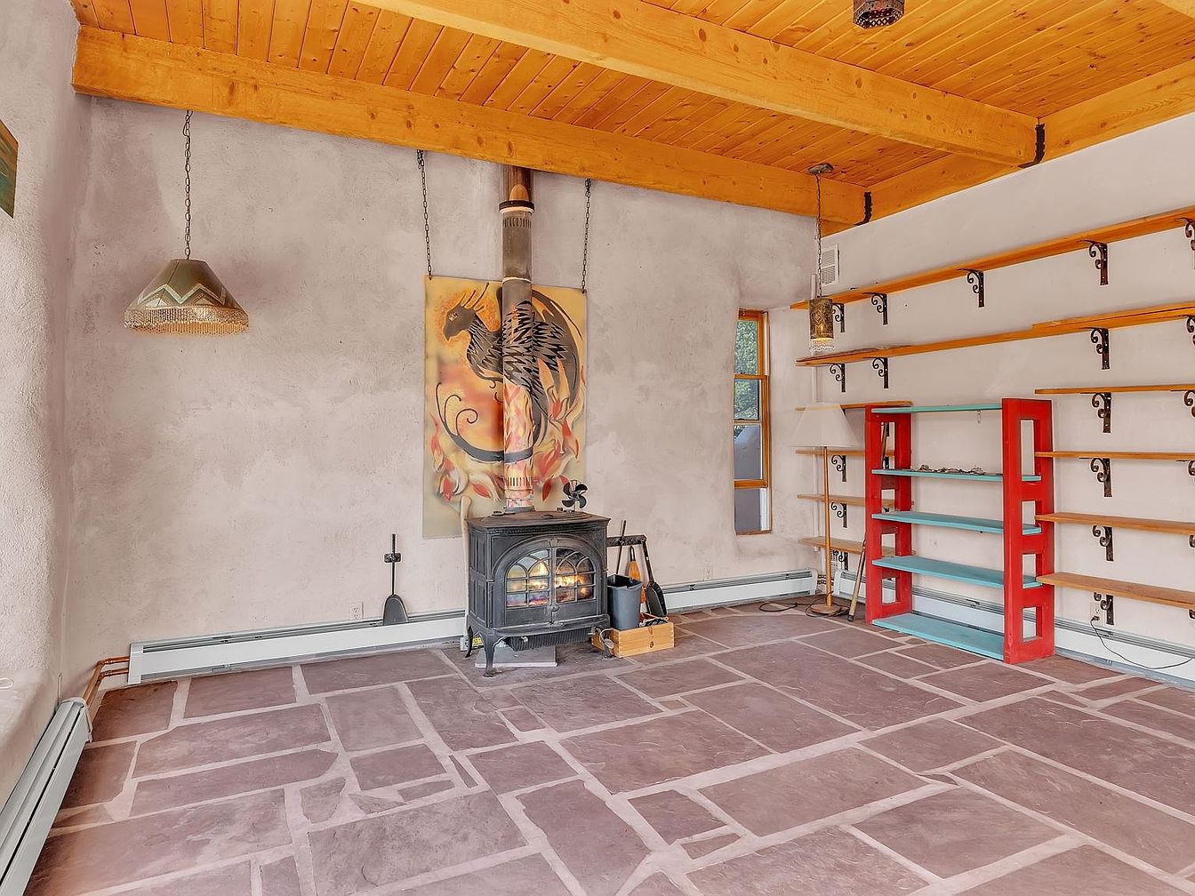 Warm and inviting space featuring a high wood-beamed ceiling and earthy stucco walls that give a cozy, rustic charm. The room anchors around a wood-burning stove with a colorful, artistic panel behind it, perfect for gathering on chilly evenings. Expansive built-in wooden shelves along one wall offer ample storage for books, games, or family treasures, making organization easy for households with children. A window allows in natural light, further enhancing the serene ambiance. The stone-tile flooring is durable and practical, ideal for active families, and the vibrant shelving unit in red and teal adds a playful, modern touch.