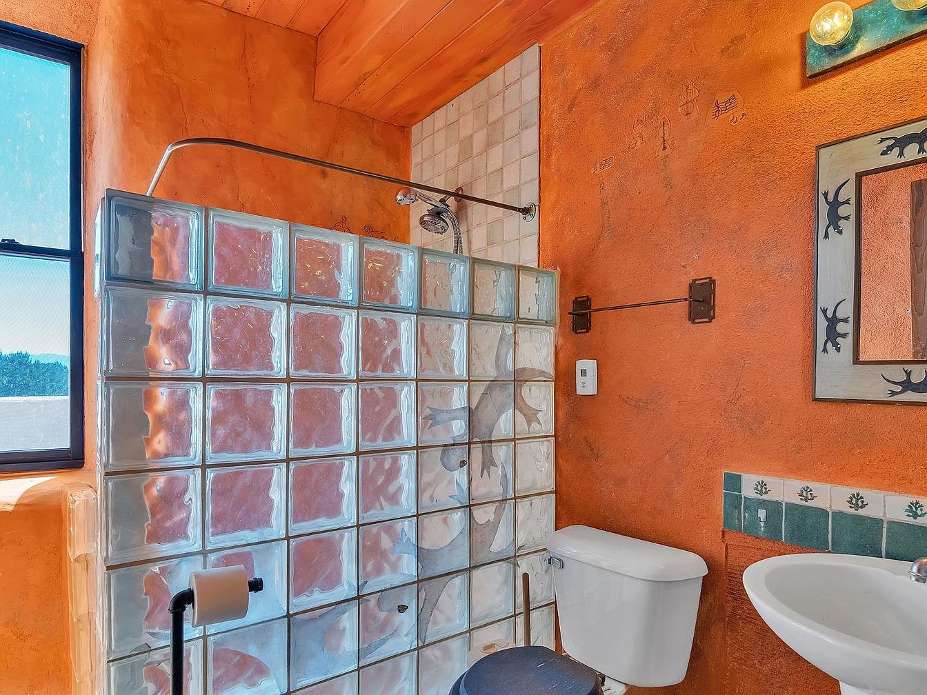 This bathroom features a unique glass block shower wall that adds both privacy and an artistic touch, allowing natural light to flow through. The walls and ceiling are finished in a warm, rustic orange stucco that creates a lively and welcoming atmosphere, ideal for families. The white porcelain toilet and pedestal sink are arranged efficiently, making good use of the compact space, while simple fixtures provide ease of use for all ages. Decorative green tiles with floral patterns above the sink add a charming accent. The window brings ample daylight, making the space feel fresh and comfortable for everyday family routines.