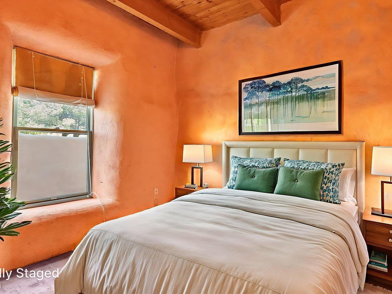 A warm, inviting bedroom features rustic adobe-style textured walls in a soft terracotta hue, complemented by a natural wood-beamed ceiling that brings a cozy, southwest charm to the space. A large window lets in soft daylight, offering a peaceful view outside while a roll-up shade adds privacy when needed, a practical choice for families. The plush, cream-upholstered headboard anchors the neatly made bed, dressed in crisp white linens, green and blue accent pillows, and patterned shams for a pop of color. Matching bedside tables with modern lamps and a serene landscape painting above the bed create a tranquil, family-friendly atmosphere.