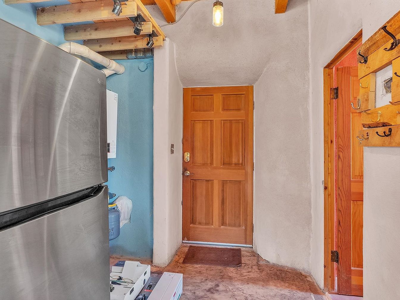 This entryway area combines practical utility with a warm, welcoming aesthetic. The solid wood door, finished in a rich honey tone, anchors the space and contrasts nicely with the smooth, cream-colored stucco walls. To the left, a large stainless steel refrigerator is visible, making this entry practical for families who value easy access to the kitchen. Exposed wooden ceiling beams and clever overhead storage show rustic character, while a sturdy wooden rack with multiple hooks along the right wall offers ample space for hanging coats and bags—ideal for bustling households. Soft, earthy hues and functional fixtures offer both comfort and style.