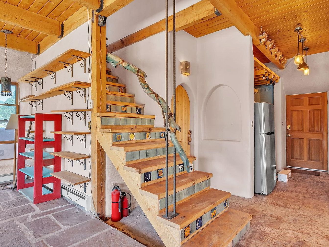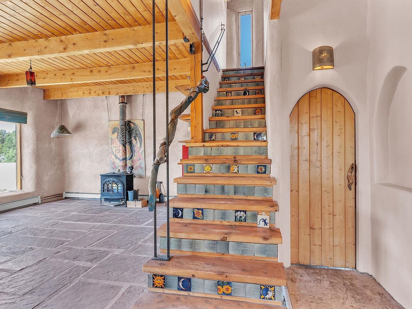 This warm and inviting staircase entryway features a beautiful blend of Southwestern and rustic aesthetics. The wooden staircase, adorned with hand-painted Spanish tiles, leads upward beneath exposed wooden ceiling beams, creating a cozy family-friendly atmosphere. Natural light streams in from a tall window at the top of the stairs, illuminating the neutral stucco walls and the arched wooden door to the right. Slate tile floors add durability, making it ideal for active family life. In the adjacent area, a wood-burning stove sits below a piece of colorful art, giving the space a welcoming and artistic touch perfect for gatherings.