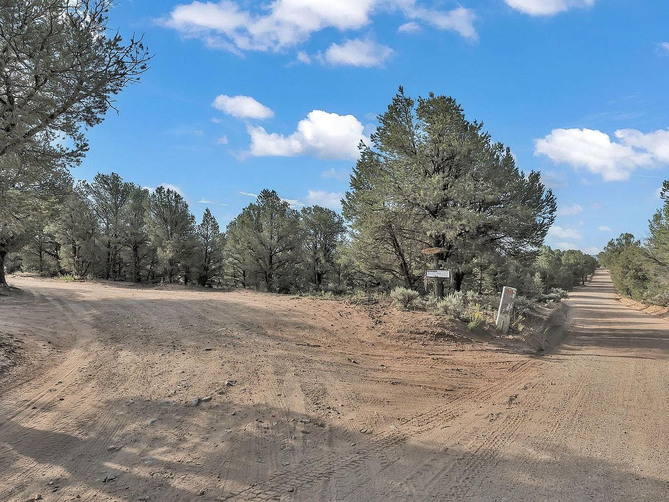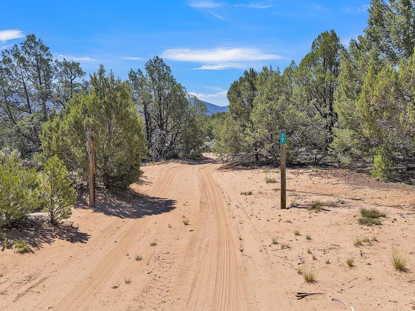 A wide dirt driveway gently curves into the property, flanked by two wooden posts, one bearing the number 77, marking the entrance and giving a sense of arrival and privacy. The path is surrounded by mature pine and juniper trees, creating a natural, wooded barrier for safety and peace, ideal for family living. The sandy ground and minimal landscaping highlight a rustic, Western aesthetic, blending seamlessly with the environment. The clear blue sky and mountain backdrop evoke a sense of space and tranquility, making it a welcoming scene for families seeking outdoor enjoyment and room for children to explore safely.