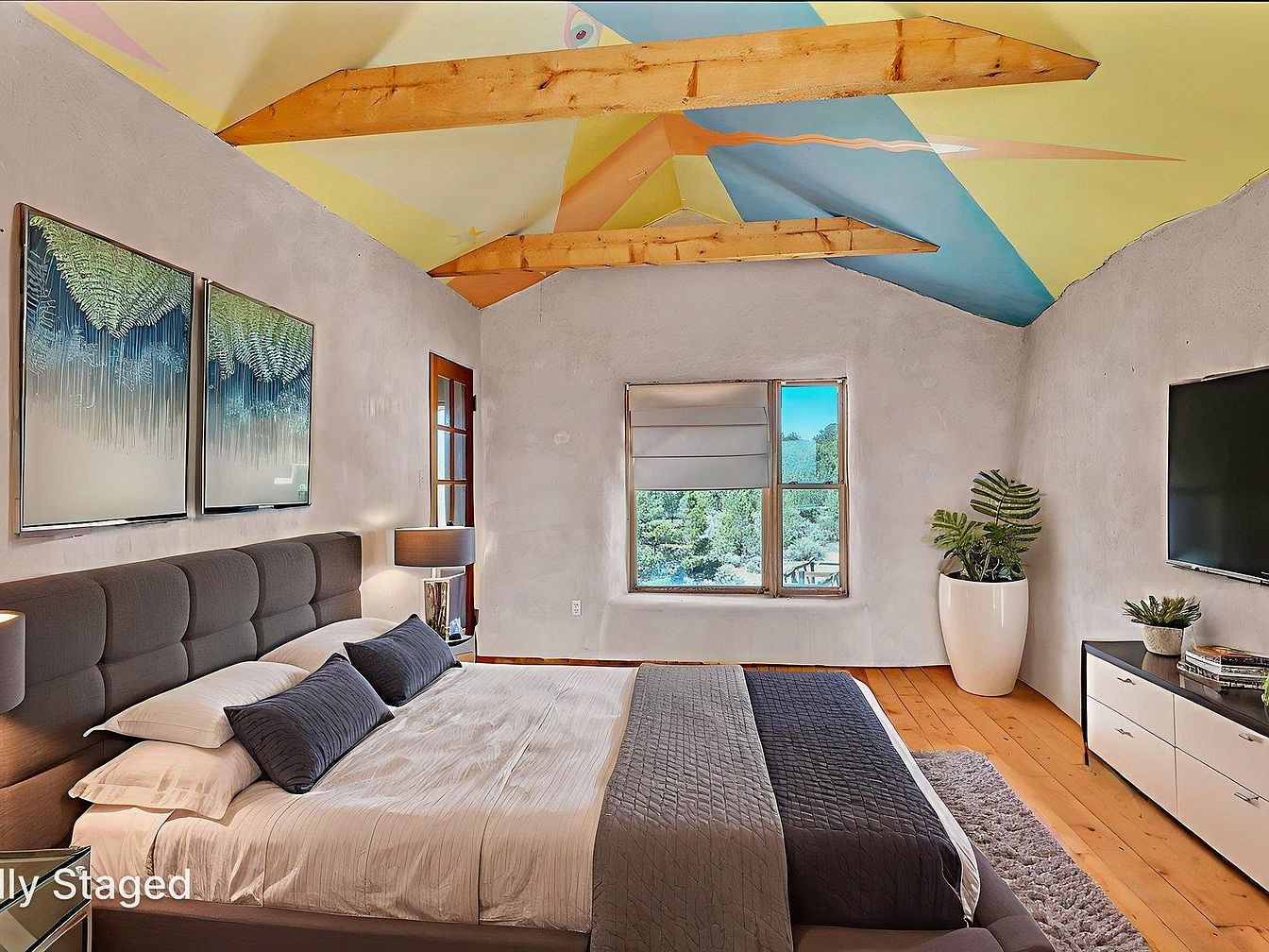 This bedroom features a spacious, airy layout with a vaulted ceiling accented by exposed wooden beams and a playful, colorful ceiling mural in yellow, blue, and pink tones. Soft gray walls create a serene backdrop, while natural wood floors add warmth and character. The bed is outfitted with cozy layered bedding in whites and grays, flanked by modern side tables and matching lamps for a sense of symmetry. Vibrant modern art hangs above the upholstered headboard. A large window invites in welcoming light and lovely tree views, while a low white dresser and decorative plants enhance the family-friendly, relaxing atmosphere.