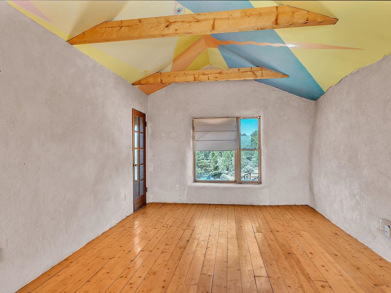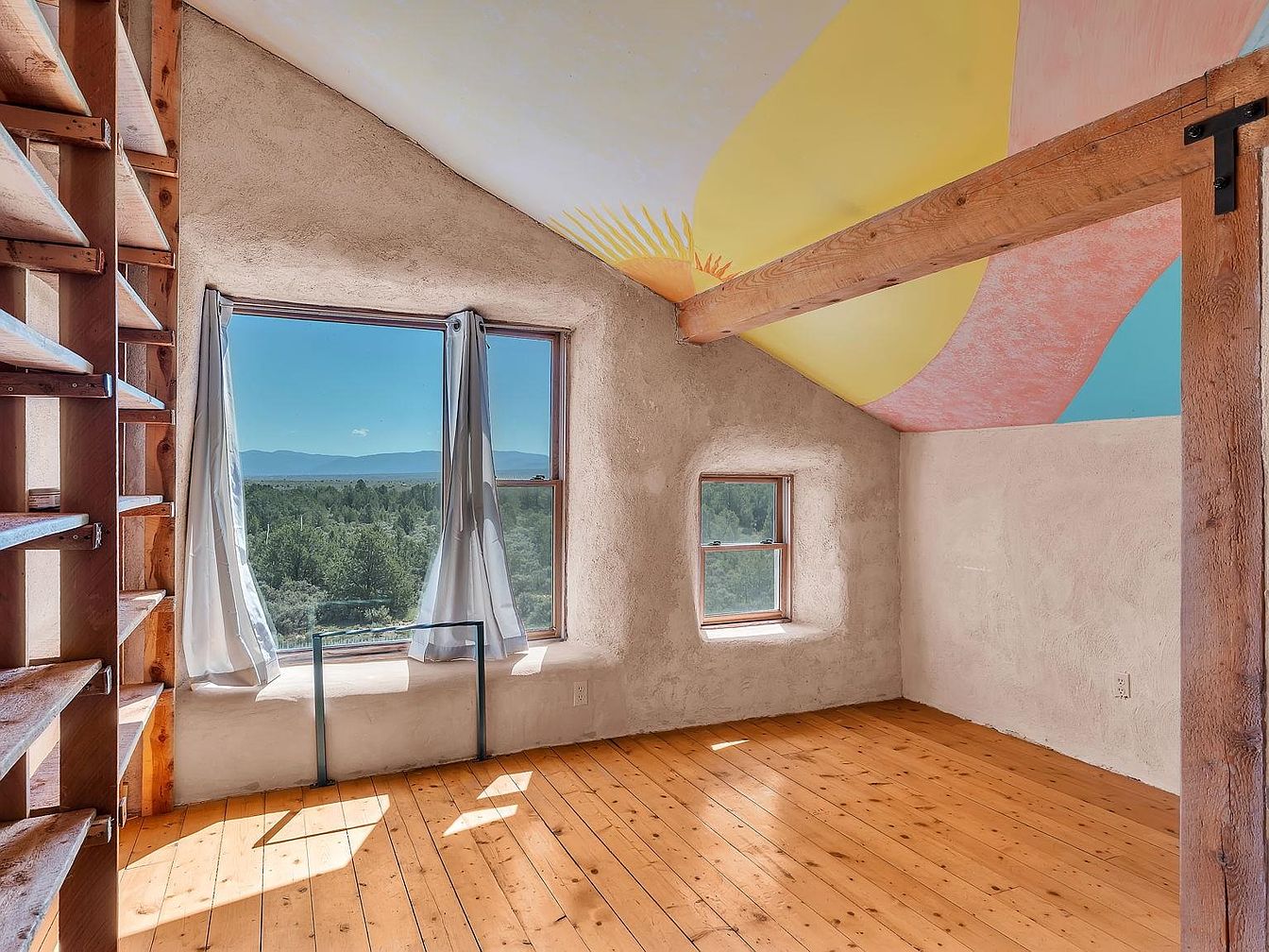 A bright, inviting bedroom corner featuring large windows that flood the space with natural light and offer breathtaking views of a forested landscape and distant mountains. The room shines with warm honey-toned hardwood floors and softly textured, light beige plaster walls, creating a cozy, rustic atmosphere. A distinctive wooden staircase adds appeal and functionality, making the space ideal for families with children who may enjoy a loft. The ceiling is whimsically painted with pastel yellow, pink, and blue swirls that evoke a sunrise, enhancing the room’s cheerful energy. Exposed wooden beams add character and architectural interest, blending modern comfort with natural charm.