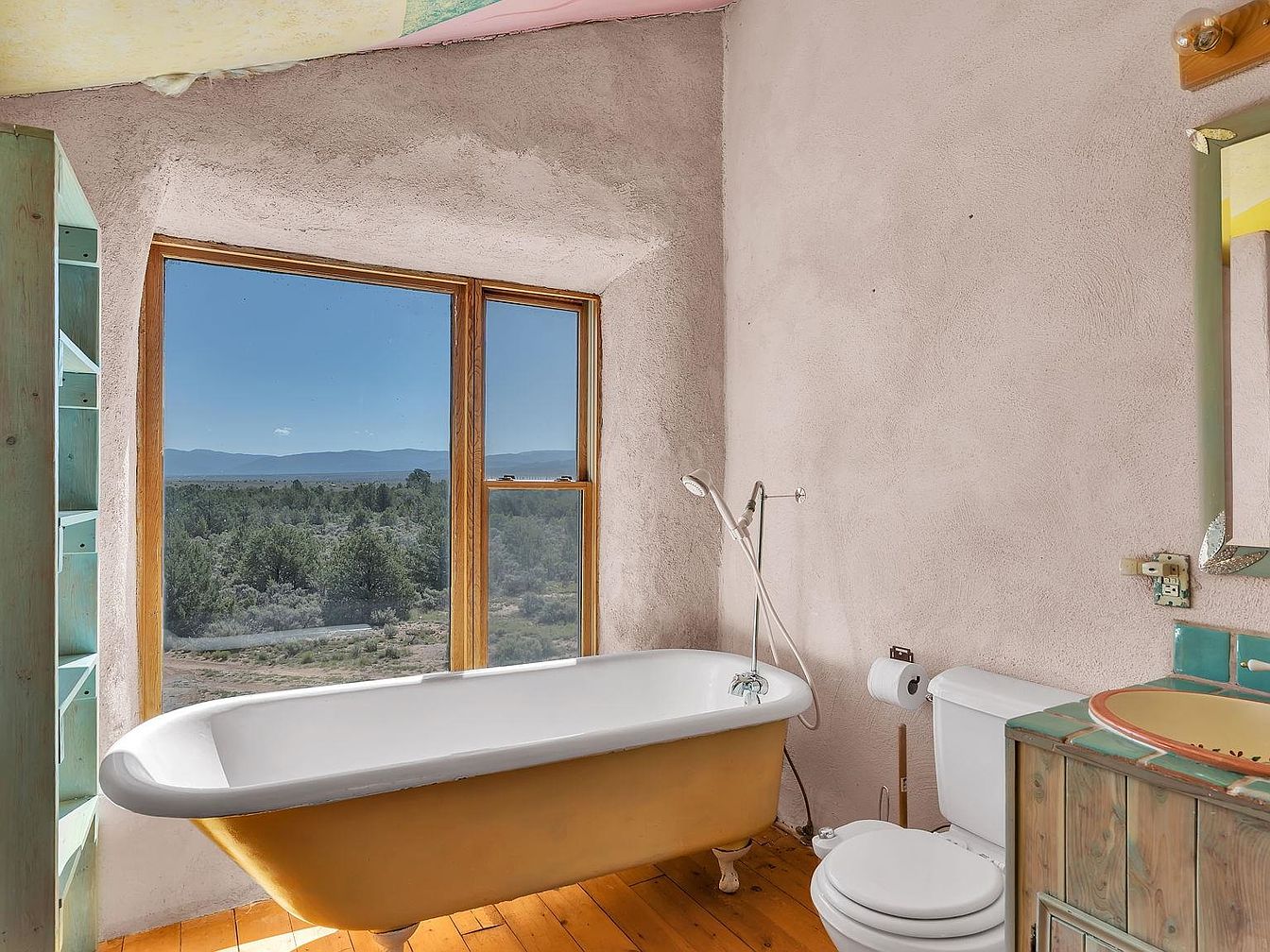 A bright, inviting bathroom filled with natural light thanks to large picture windows that offer stunning views of forests and distant mountains. A freestanding clawfoot bathtub with a warm yellow exterior sits beneath the windows, making it ideal for relaxing soaks while enjoying the tranquil scenery. The room’s rustic adobe-style walls, soft pastel ceiling, and natural wood floors create an earthy, calming atmosphere. A wooden vanity with turquoise tile accents and an adjoining open shelving unit add character and storage, making this space both practical and stylish for families. Soft colors and ample space promote comfort and serenity.