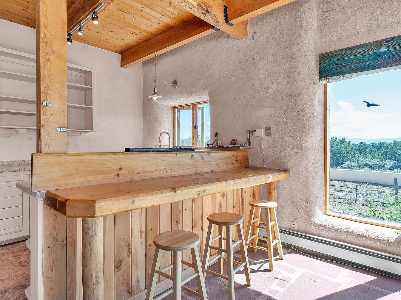 This open kitchen bar features a rustic wooden counter with a thick, natural wood finish, accented by three matching wooden stools that invite casual dining or homework sessions. The bar is supported by sturdy posts and overlooks a spacious area filled with natural light from a large picture window offering scenic views of the outdoors. Exposed ceiling beams add architectural charm and warmth, while light-colored stucco walls create a soft, inviting atmosphere. Built-in open shelves and ample counter space make it both practical and family-friendly, providing plenty of room for cooking, gathering, and enjoying time together.