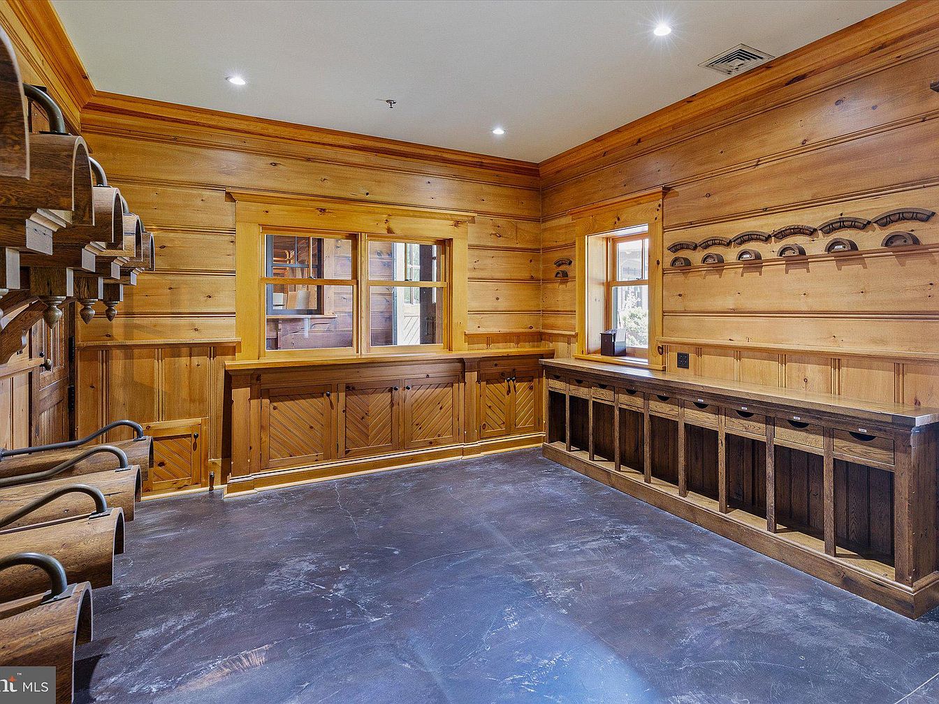 A spacious mudroom features wood paneling throughout, emphasizing natural aesthetics. The walls display warm, honey-toned wood, complemented by intricately carved wooden shelves. A broad, dark stone floor contrasts elegantly with the light wood, providing durability. On the left, several hooks hang beneath curving wooden arches, ideal for coats and bags. Opposite, a long, dark-stained bench offers storage beneath, with several cubbies for organization. Large windows invite natural light, enhancing the inviting atmosphere. The overall design combines rustic charm with practical functionality, ideal for a transitional space that welcomes both nature and daily life.
