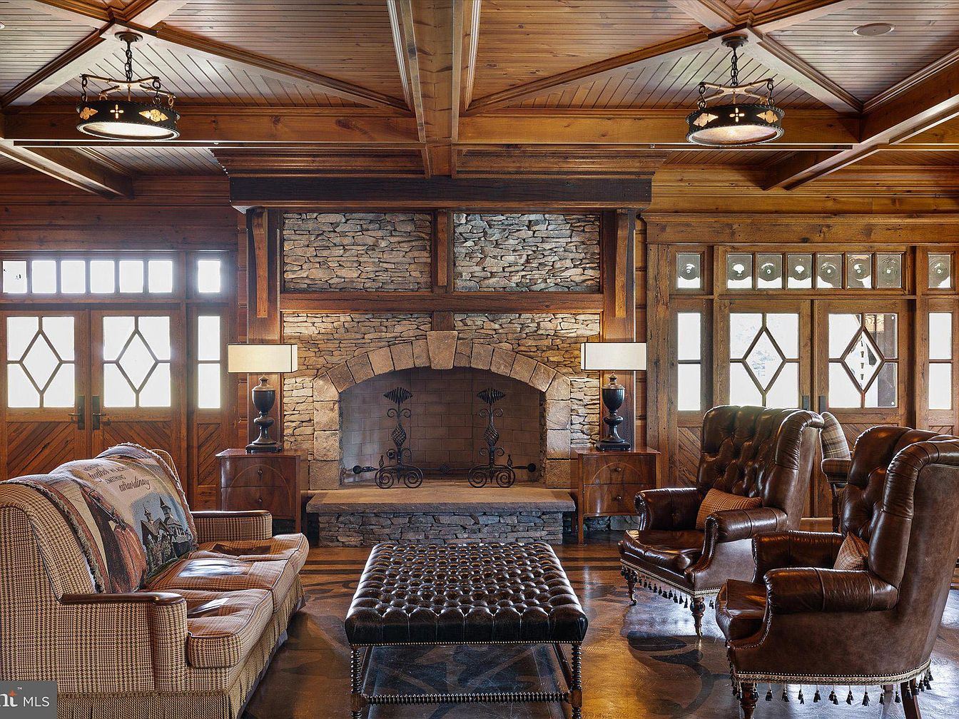 This spacious living room features a warm, rustic aesthetic with rich wooden walls and a coffered ceiling, showcasing intricate beams. The color scheme marries earthy tones with pops of floral patterns on the upholstered sofa. A central coffee table of dark wood contrastively anchors the arrangement, surrounded by an assortment of comfortable seating, including a plush leather armchair and checked chairs. The room is punctuated by a striking stone fireplace, serving as a focal point, with elegant lamps on either side providing soft lighting. Large, decorative windows illuminate the space, enhancing the cozy atmosphere.