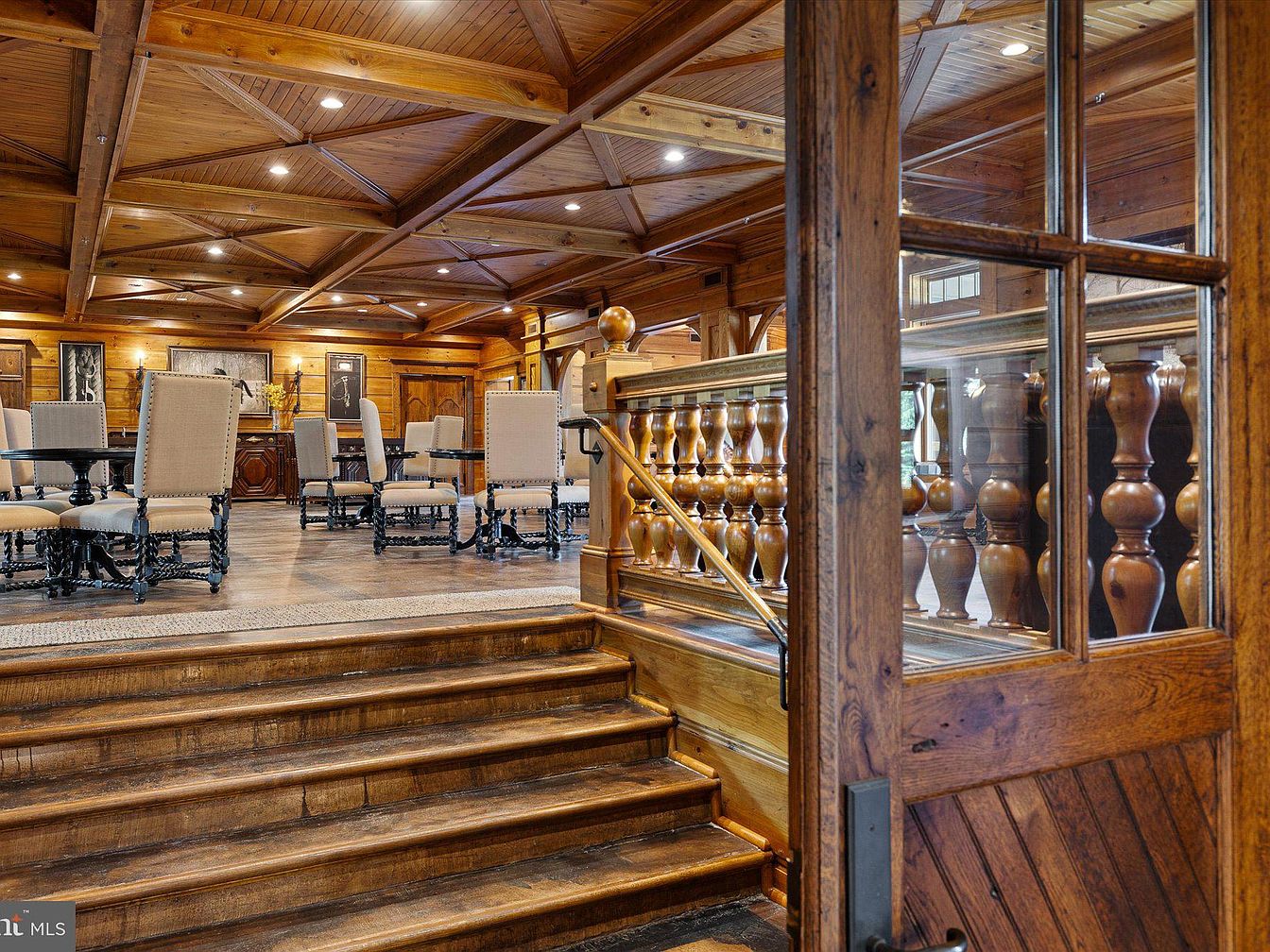 A spacious dining area features a warm, rustic ambiance. The high, wooden coffered ceiling complements the rich wooden flooring, enhancing the intimate atmosphere. Multiple round tables with upholstered chairs provide seating, each with a subtle blend of natural tones. The walls are adorned with framed artwork and rustic decor, adding character. A nearby wooden buffet showcases fine craftsmanship, while large windows invite natural light, illuminating the space. Elegant wooden railings and a staircase lead to an upper level, offering a sense of openness and continuity. The overall aesthetic is inviting, ideal for gatherings and meals.