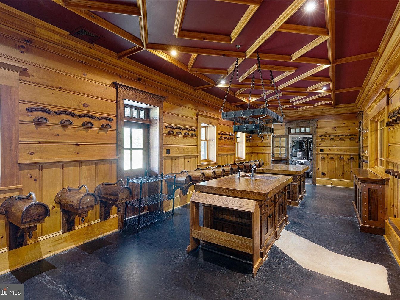 This kitchen features warm wooden paneling with a rich, natural finish, accentuated by a coffered ceiling painted in deep red. Centered in the space are two large, rustic wooden islands with intricate cabinetry, showcasing a blend of traditional craftsmanship and practicality. A metal pot rack hangs above the islands, adding to the functional aesthetic. The room is illuminated by natural light streaming through multiple windows and recessed ceiling lights. A series of wooden mail slots adorn one wall, emphasizing the home’s unique character. The black flooring contrasts elegantly with the warm tones of the wood, creating an inviting atmosphere.