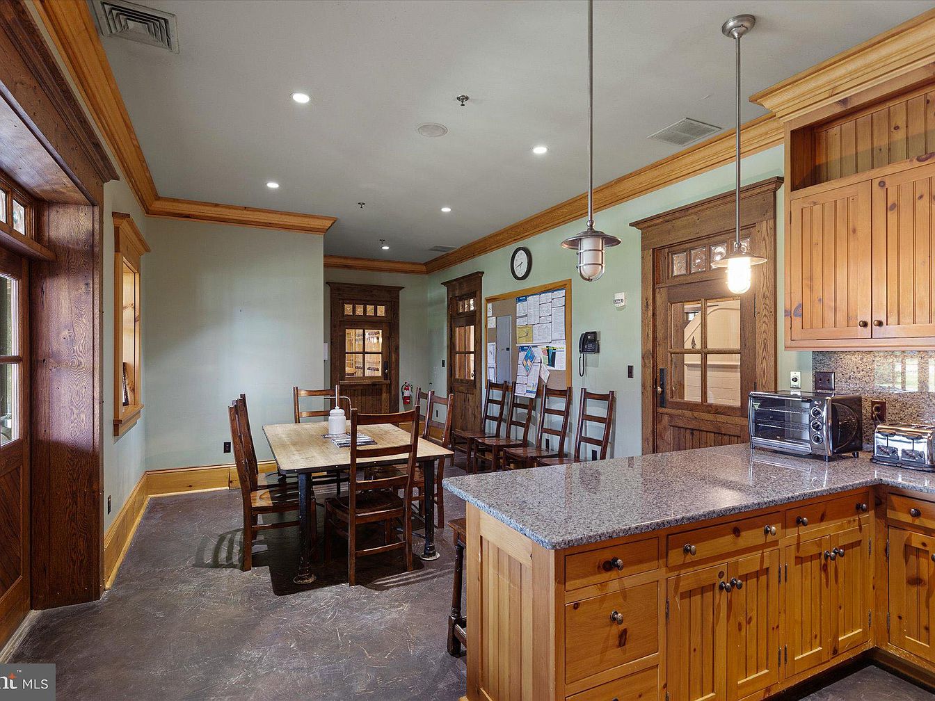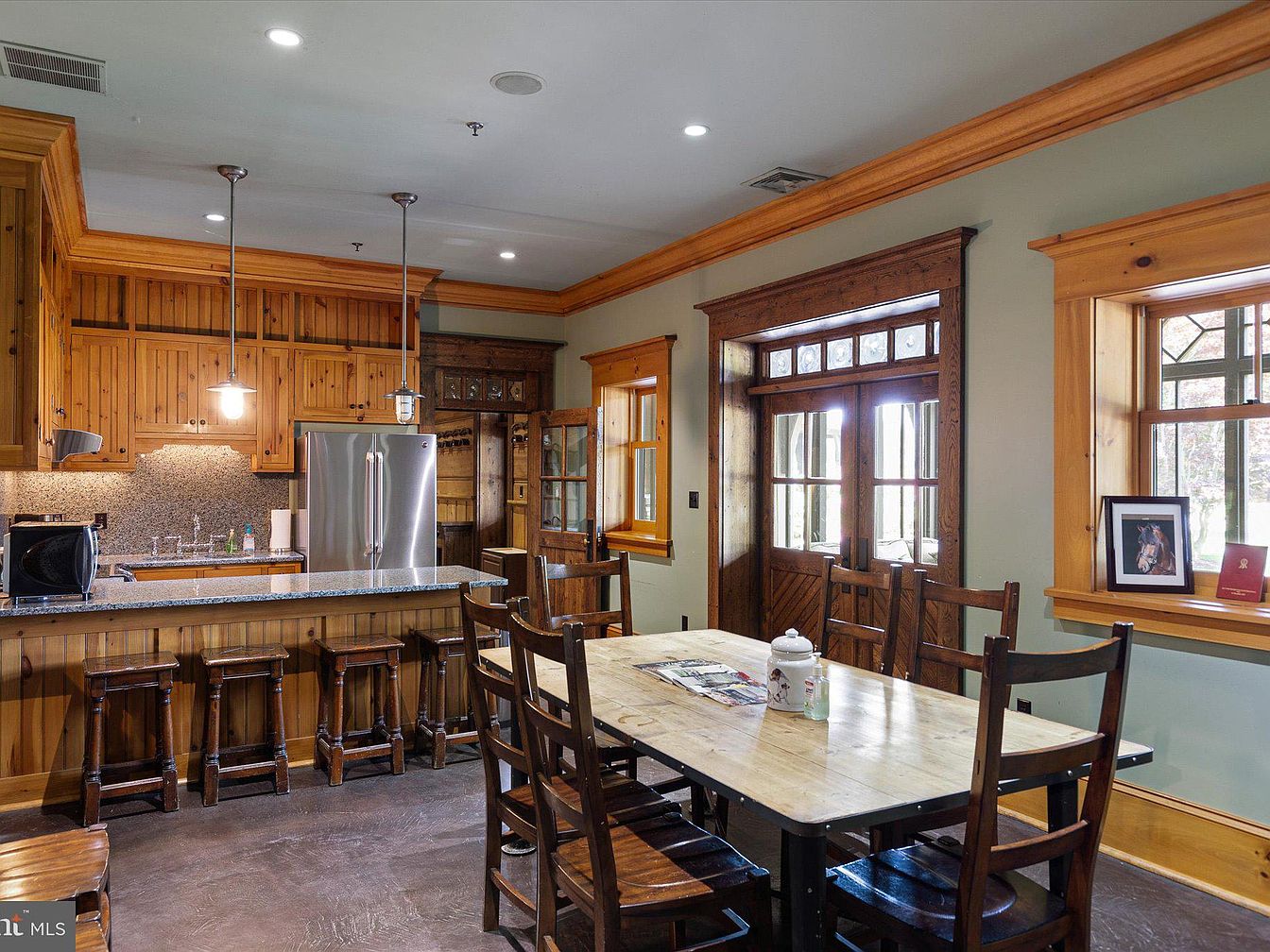 The kitchen features warm wooden cabinetry with a rich, natural finish, complementing the rustic vibe. A prominent center island with a granite countertop serves as the focal point, surrounded by high-backed wooden stools. The flooring is a polished concrete, adding an industrial touch. Natural light pours through large windows, highlighting the exquisite woodwork around the doorways and window frames. Pendant lights hang above the island, offering modern illumination against the backdrop of traditional materials. An inviting dining table sits nearby, set against a wall adorned with charming art and decor, enhancing the welcoming atmosphere.