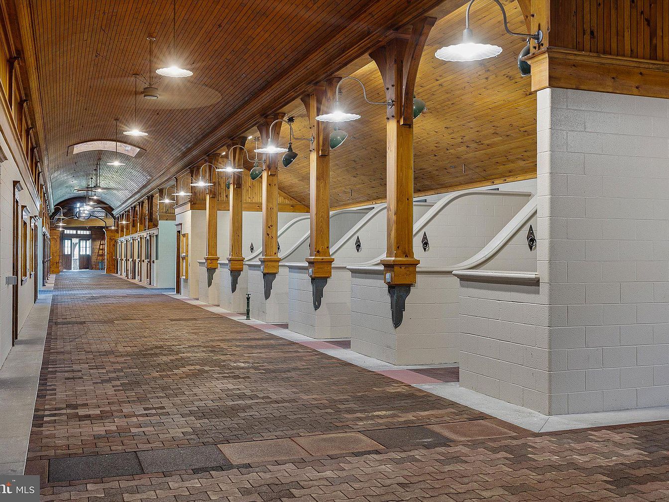 This spacious stable corridor features a high wooden ceiling supported by grand wooden beams, creating an airy atmosphere. The walls are a clean white, contrasting with the rich, warm tones of the wooden structure. On either side, individual horse stalls are neatly lined, each equipped with brass accents and decorative hardware. The floor is paved with a combination of stone and brick, offering both aesthetic appeal and functionality. Ample overhead lighting illuminates the passage, showcasing the architectural details while enhancing the rustic charm. This historic setting evokes a sense of nostalgia and timeless elegance.
