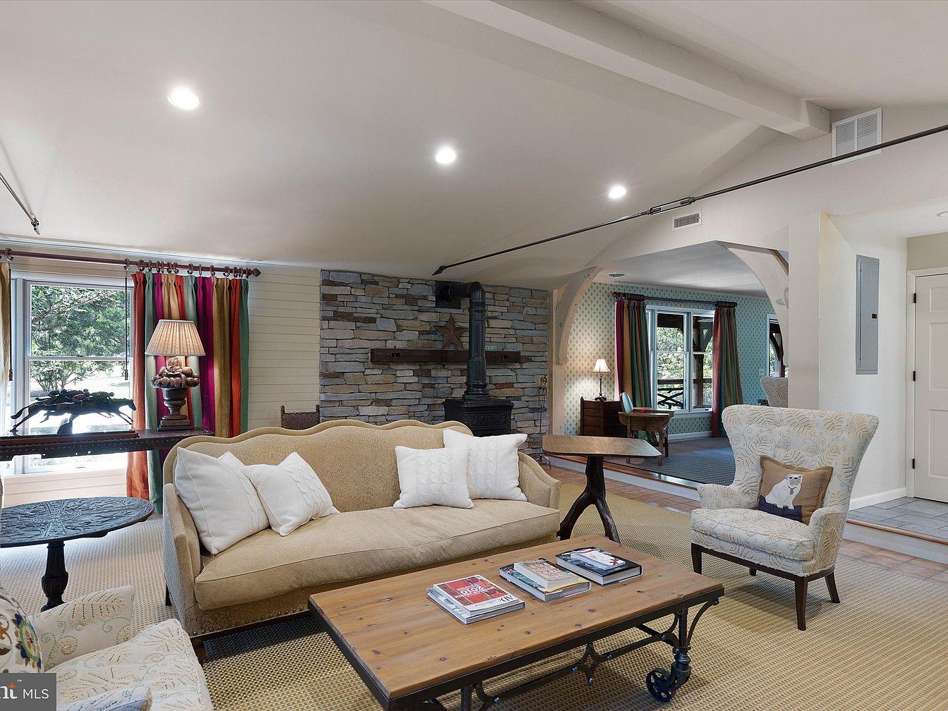 This inviting living room features a cozy layout with a soft beige sofa adorned with fluffy white pillows, complemented by an intricately patterned armchair. Natural light floods in through large windows adorned with colorful striped drapes. A striking stone fireplace serves as the focal point, surrounded by neutral-toned walls and an archway leading to another room. The hardwood floor is covered by a light area rug, adding warmth. A rustic wooden coffee table, laden with books and decor, contrasts elegantly with the more modern elements of the space, creating a harmonious blend of comfort and style.