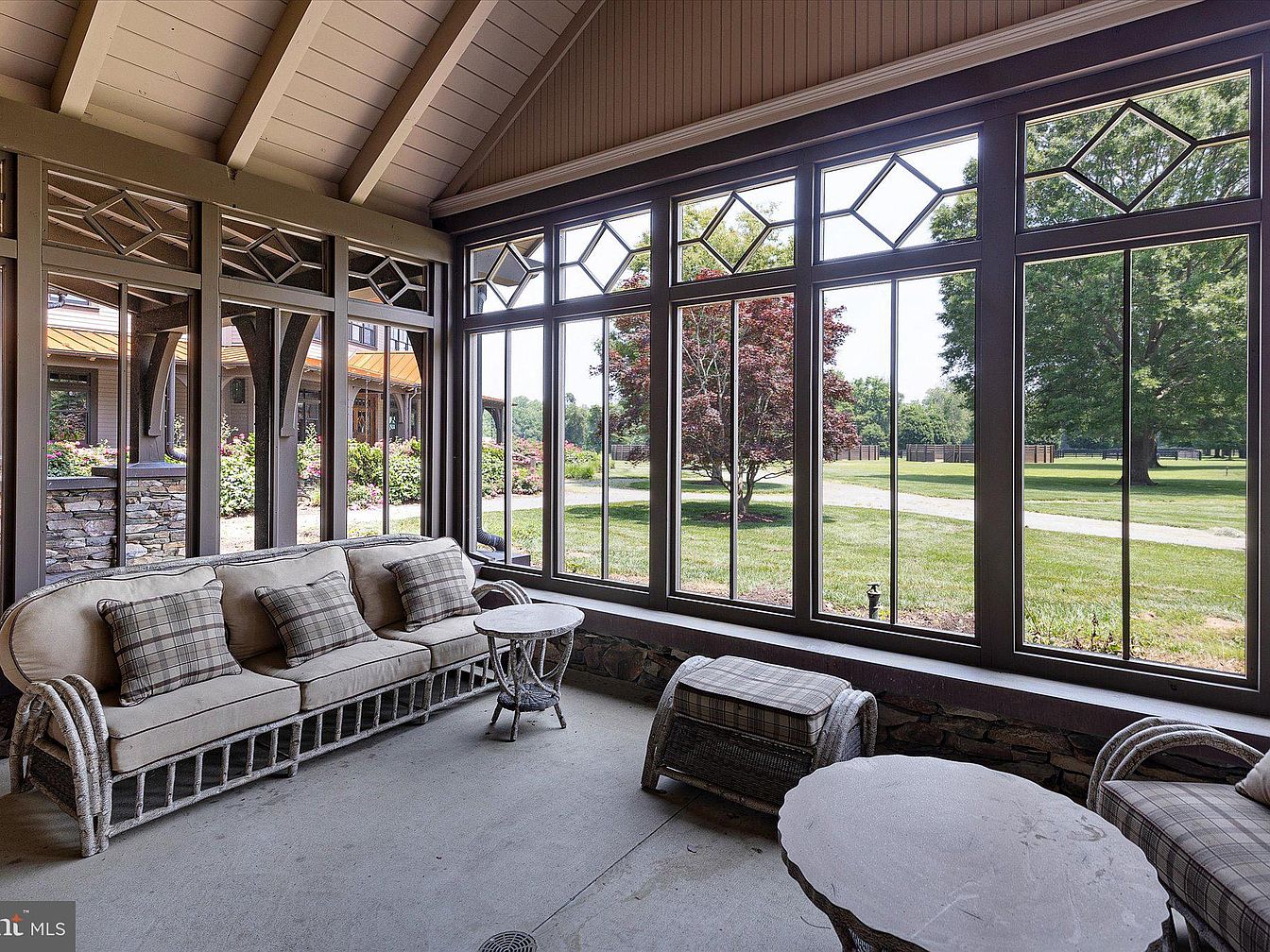 This sunroom features large, elegantly framed windows with diamond-patterned glass that allow abundant natural light and scenic views of the lush green yard outside. The warm, neutral tones of the walls complement the soft beige sofa adorned with plaid cushions. The cozy seating arrangement includes a small round table made of rustic wood, enhancing the inviting atmosphere. Exposed wooden beams in the ceiling add character, reflecting traditional craftsmanship. The natural stone wall adds a textural contrast, harmonizing with the overall aesthetic, making this space perfect for relaxation while enjoying the beauty of the outdoors.