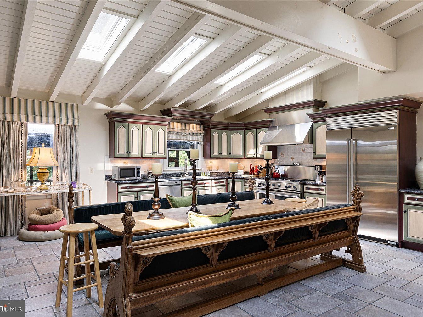 This kitchen showcases a spacious layout with a high ceiling accentuated by exposed wooden beams. The cabinetry features a rich combination of dark and light tones, with intricate detailing and a polished granite countertop. A large stainless steel refrigerator and professional-grade stove are seamlessly integrated, enhancing functionality. Sunlight filters through skylights, creating an inviting atmosphere. The dining area boasts a unique wooden table with ornate carvings, complemented by sturdy, stylish seating. A soft color palette with hints of green and beige, along with decorative elements like candlesticks and a vintage lamp, adds warmth and charm to this modern yet timeless space.