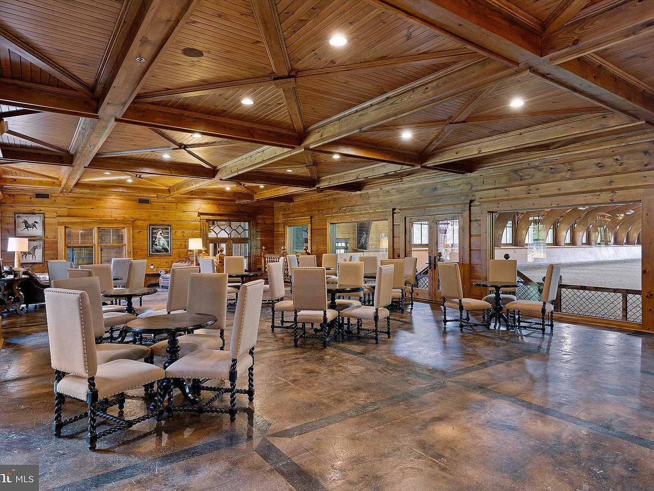 This spacious great room features a warm, rustic aesthetic characterized by rich wooden walls and a high, exposed beam ceiling. The flooring, made of polished concrete, reflects light and complements the earthy tones of the wood. Grouped seating arrangements with plush, light-colored chairs surround dark, circular tables, promoting social interaction. Soft lamps illuminate the room, enhancing the cozy ambiance. Artwork of equine subjects decorates the walls, adding a touch of character and warmth. Large windows at one end bring natural light in and provide views of the outdoors, blending the interior space with the surrounding nature.