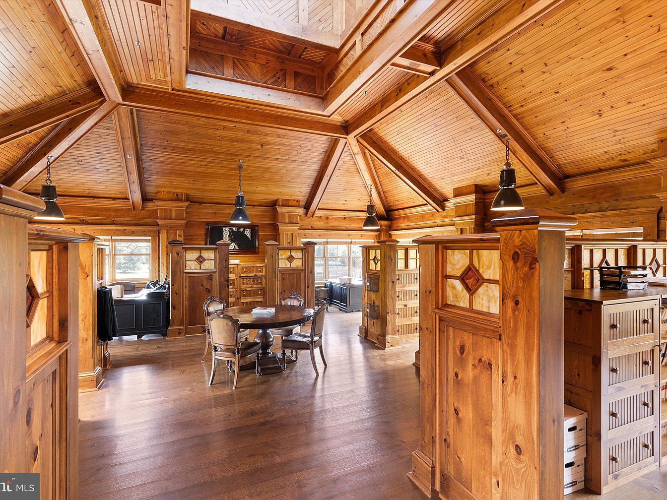 This space features an expansive open-layout concept, highlighted by a high, vaulted ceiling clad in rich wood paneling. Natural light floods through large windows, enhancing the warm, earthy tones of the wood. Striking architectural details include exposed beams and decorative accents on wooden posts, adding character. A round dining table with elegant, upholstered chairs occupies the center, creating a cozy gathering spot. Surrounding built-in cabinets blend functionality and aesthetics, showcasing craftsmanship. The glossy hardwood floor reflects light, while contemporary pendant lights above add a modern touch, combining rustic charm with modern convenience.