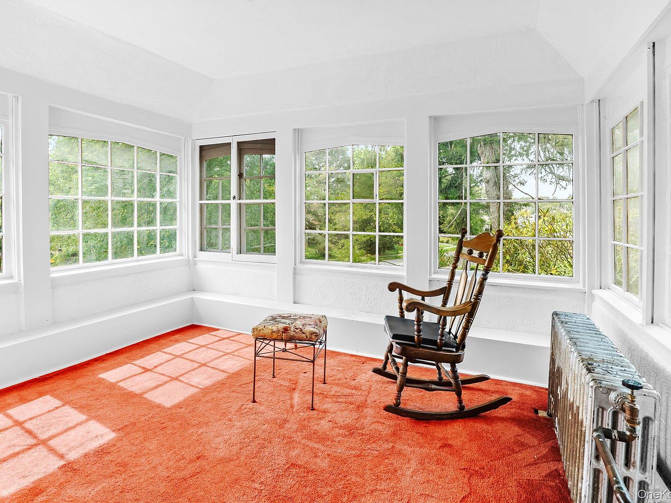 The sunroom features large, multi-paned windows that flood the space with natural light, creating a warm and inviting atmosphere. The walls are painted white, which enhances the brightness while keeping the overall aesthetic clean and airy. A vibrant orange carpet covers the floor, offering a striking contrast. In one corner, a classic wooden rocking chair invites relaxation, paired with a small, patterned stool for added character. The room’s architecture includes a sloping ceiling, adding a cozy feel, while a vintage radiator along one wall enhances the home’s historic charm and functionality.
